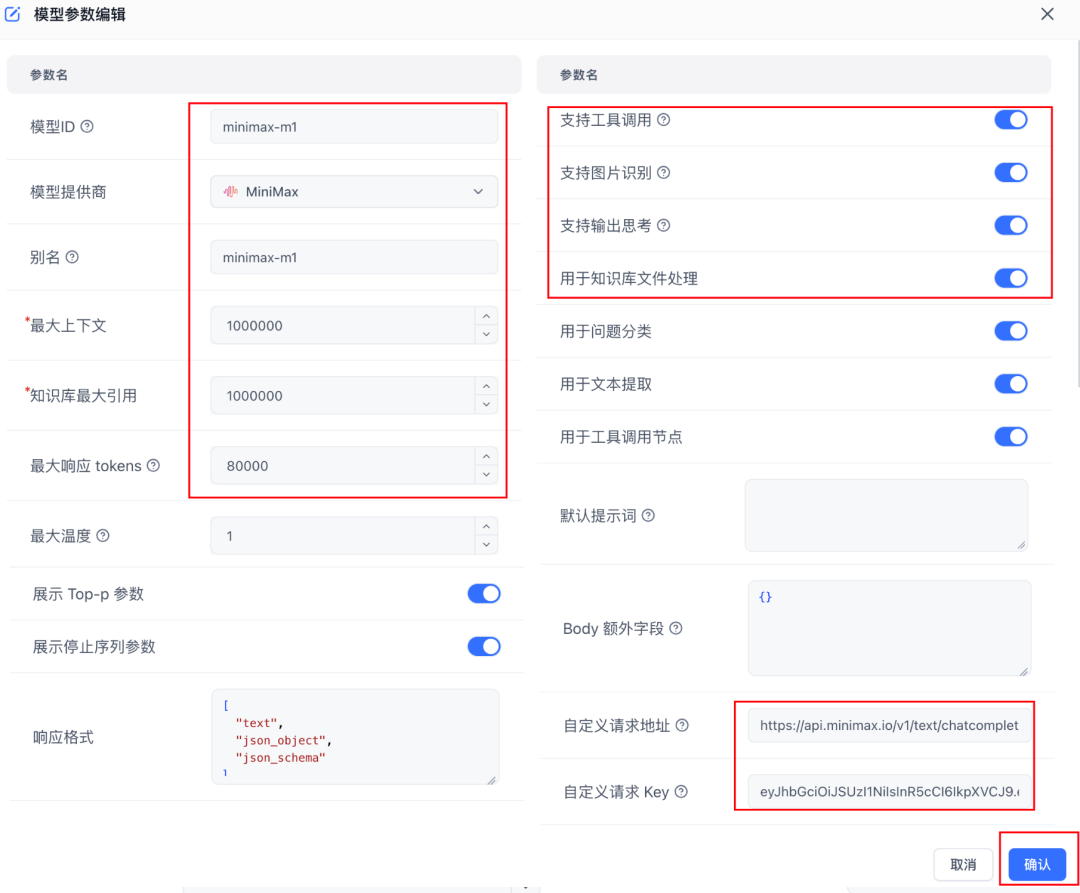 如果是使用fastgpt搭建的知识库,也可以参考下面的配置接入MiniMax-M1模型。