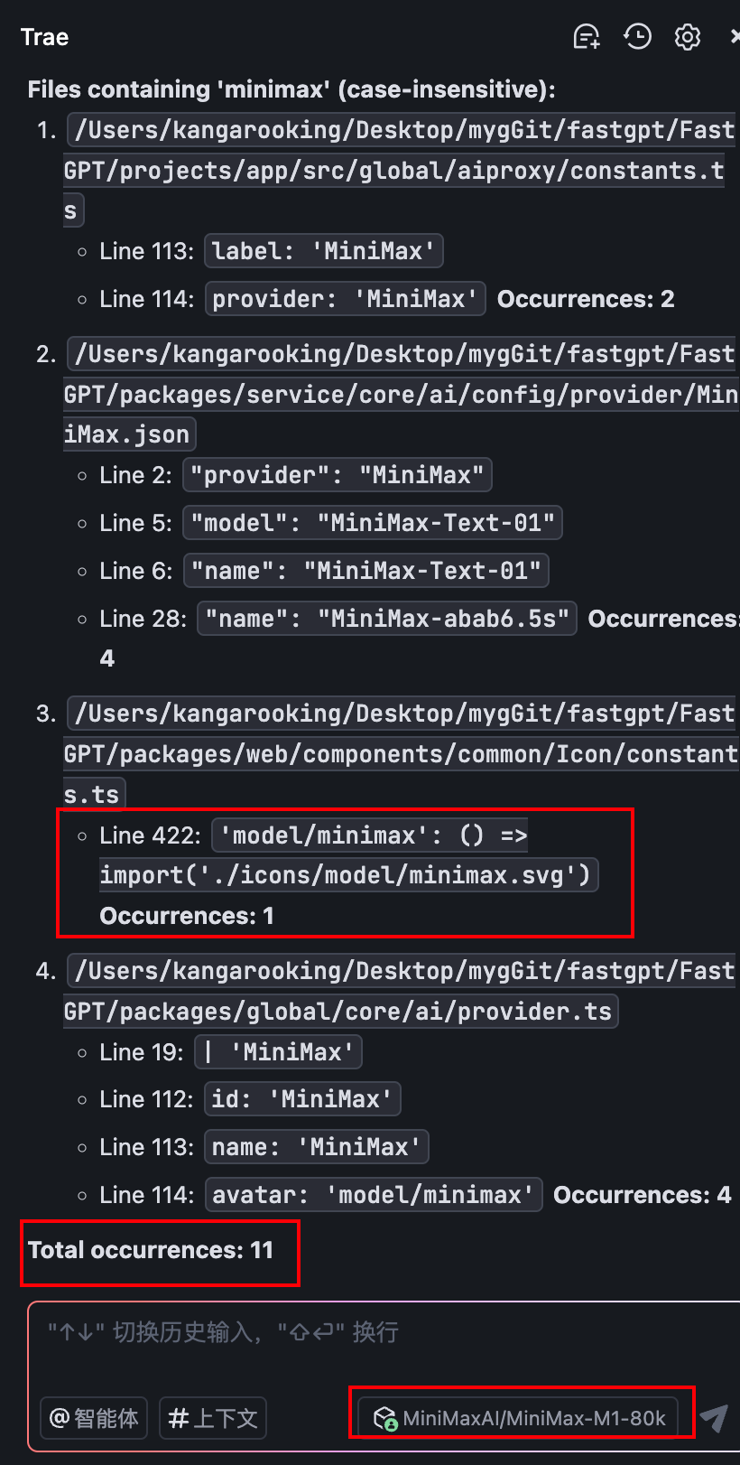 右边是MiniMax-M1给出的结果:4个文件,出现11次...