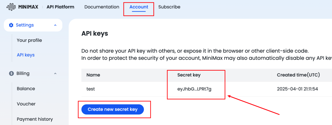 同时,为了方便后续API的测试,我们还需要获取MiniMax的apikey、API地址