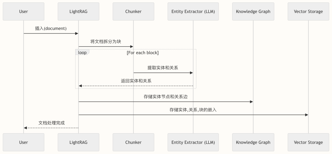 LightRAG中的完整数据流从文档摄取到查询响应遵循循环模式: