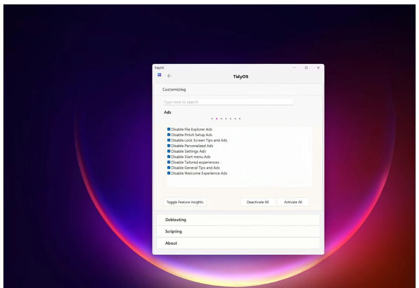 但如果不想再忍受这些呢?TidyOS是一款系统清理工具,能执行多项实用任务,让你的Windows不再那么讨人厌。它可以禁用“开始”菜单中的广告、“完成设置”广告,卸载预装应用,还能关闭各种信息收集功能以及其他可能占用系统资源的不必要功能。TidyOS功能丰富,而且用户界面十分简洁,上手难度低,能显著提升你的Windows使用体验。