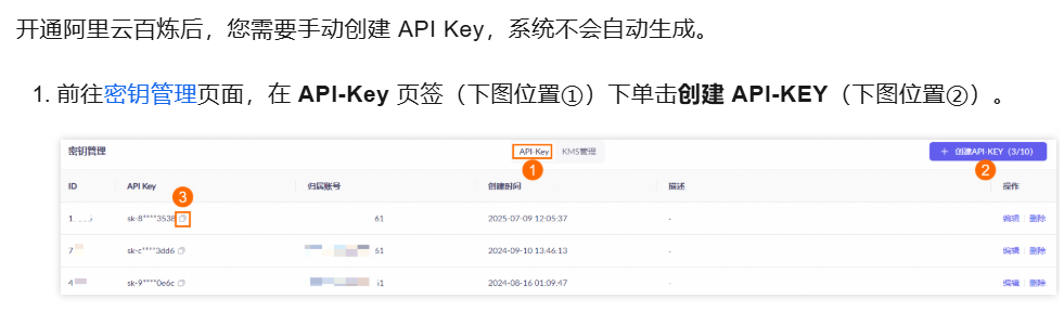 在模型广场里开通一个模型,例如qwen3-max-preview,新用户有很多的免费的token可以使用。模型名称,如qwen3-max-preview。建议将api key 配置到系统环境中。本文获取的API Key。2、使用api key。,获取你的api密钥。