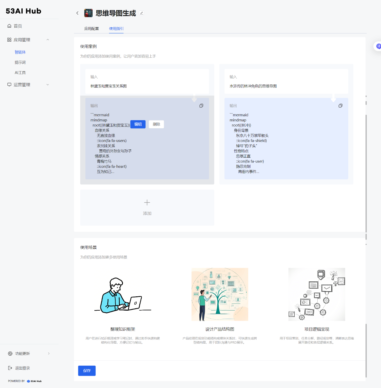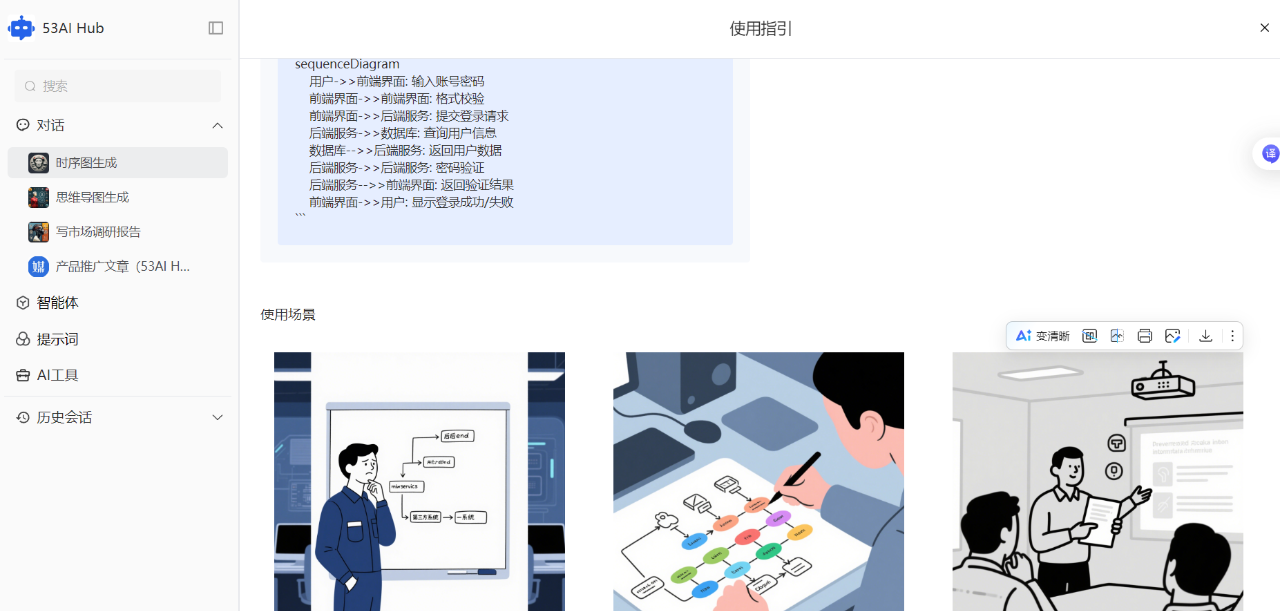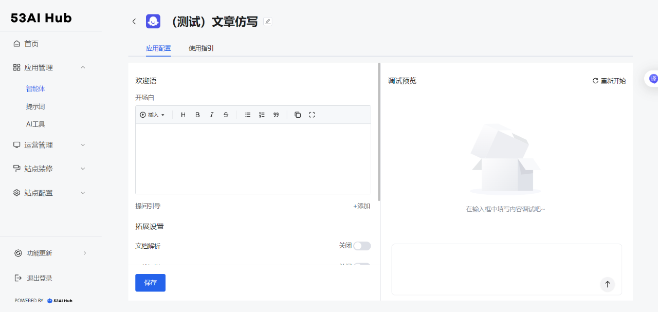 53AI Hub 设计了专属「使用指引」,通过使用指引的添加,让智能体的可操作性更强。