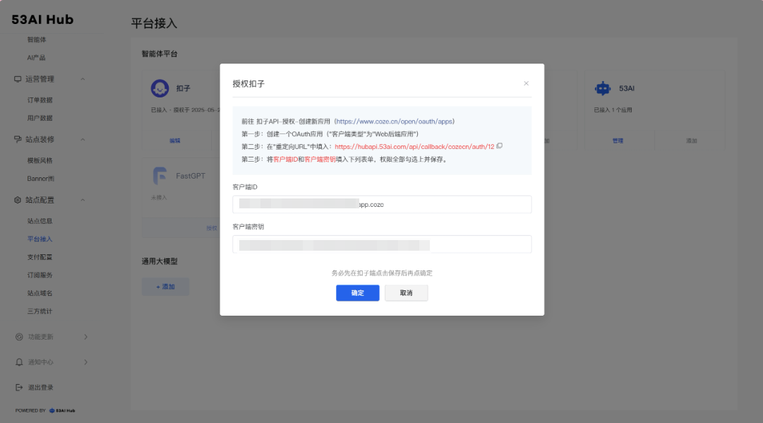 回到 53AI Hub “ 站点配置→ 平台接入” ,点击平台接入中扣子卡片的「授权」
