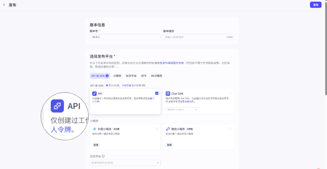 在「选择发布平台 - API」区域,勾选 API 权限