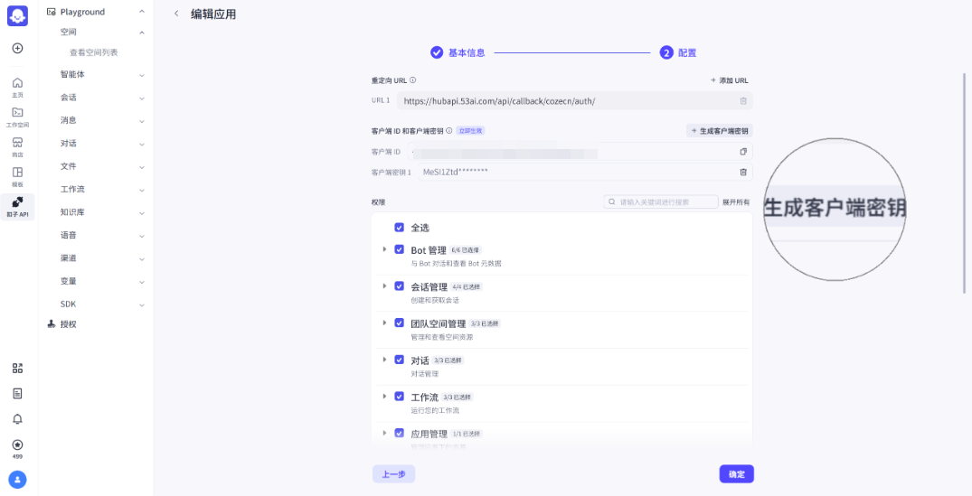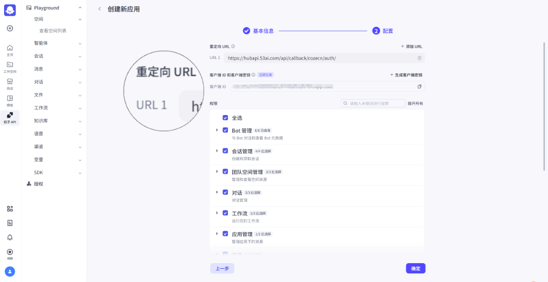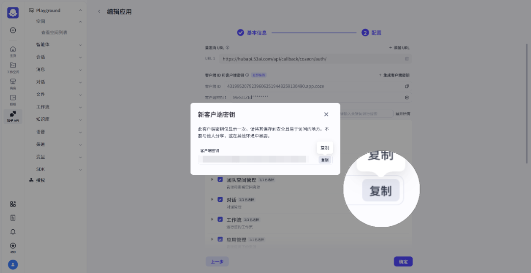 填写回调地址(可在“平台接入>授权扣子>弹窗操作指引”直接复制):https://hubapi.53ai.com/api/callback/cozecn/auth/