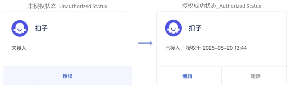 授权成功后返回53AI Hub,扣子图标下方显示「编辑 / 删除」即表示接入完成