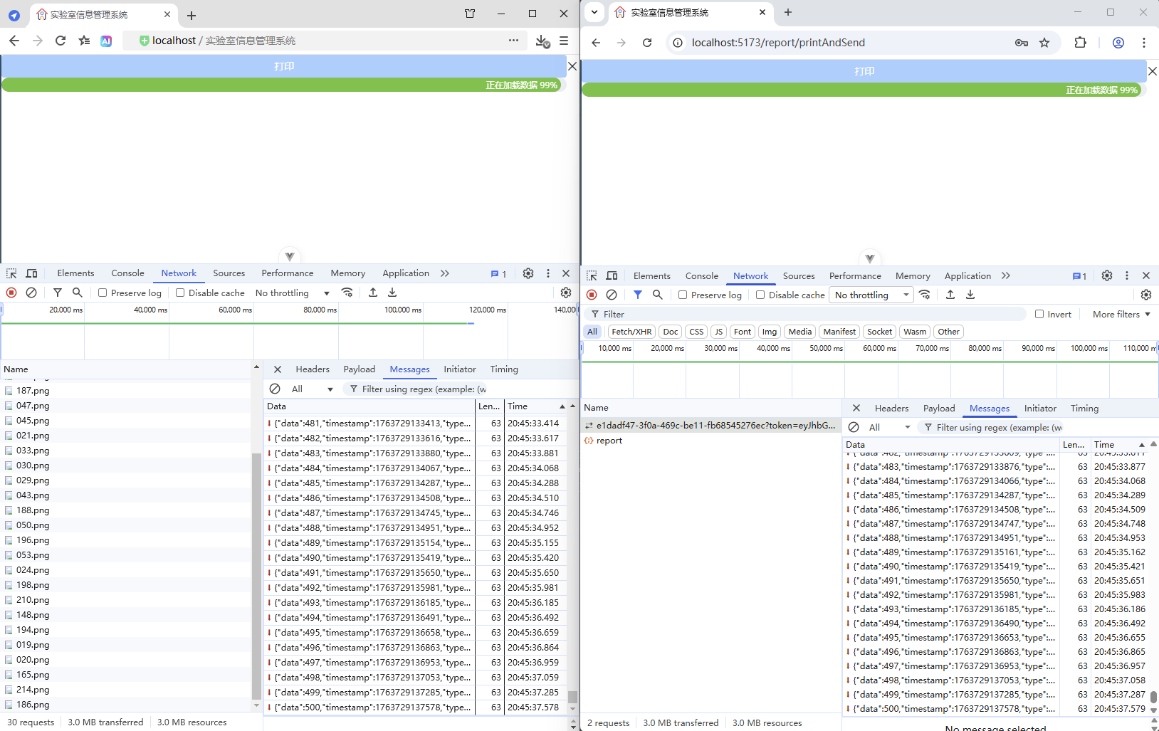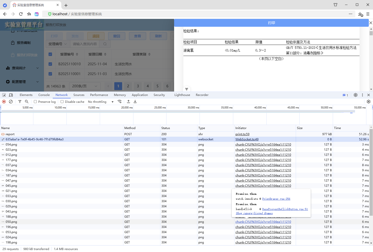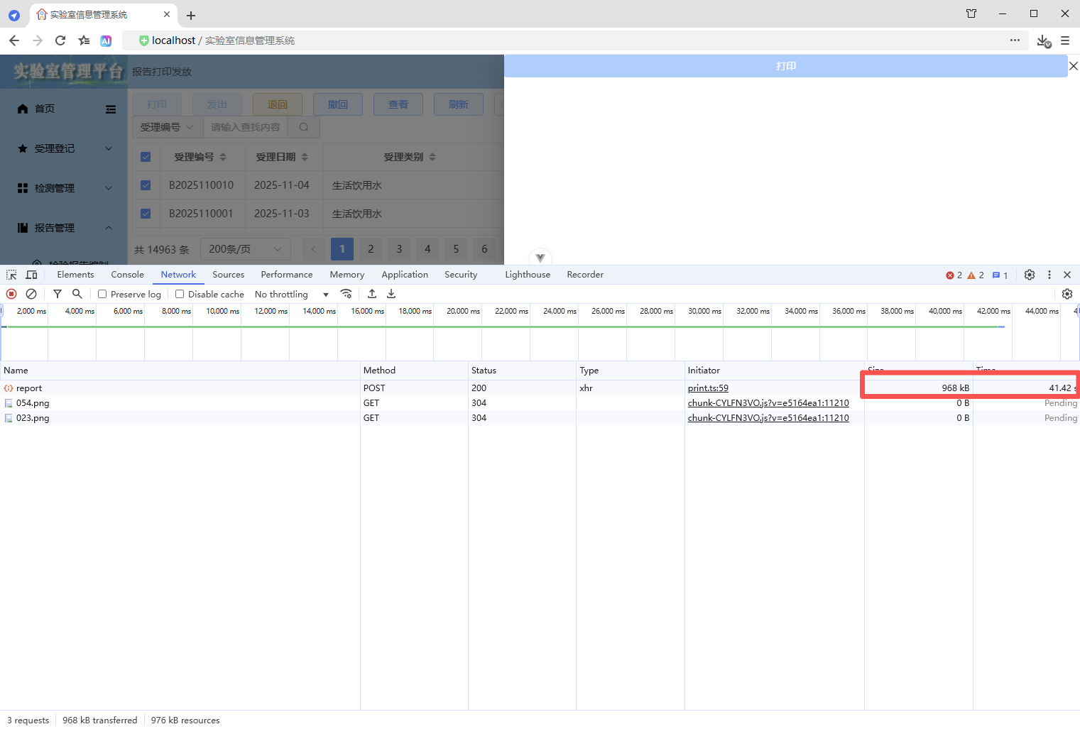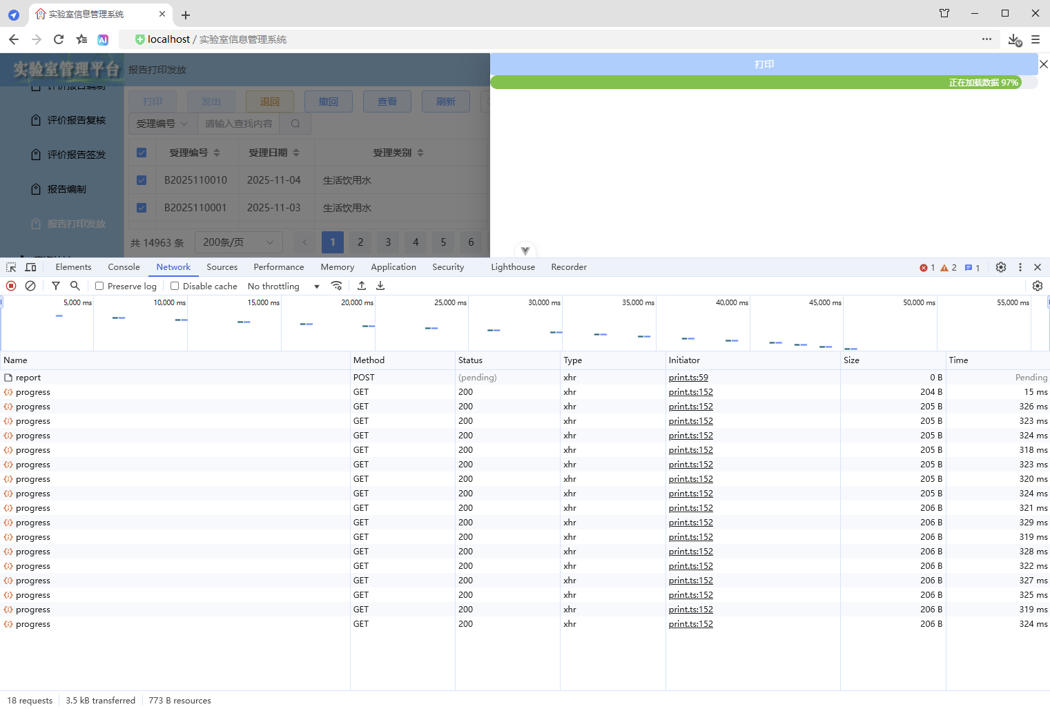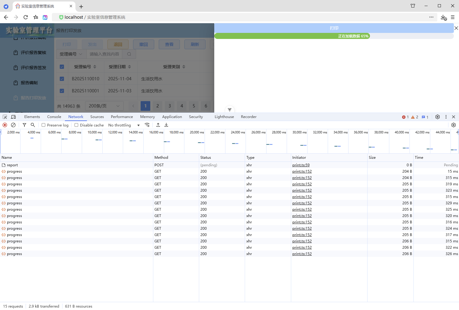 初始情况,打印没有进度条显示:点击【打印/查看】,弹出打印对话框,开始加载数据(200份报告),数据已加载,耗时41.42秒,这个过程页面一直没有变化,需增加进度显示,增强使用体验。原来的代码:打印抽屉。