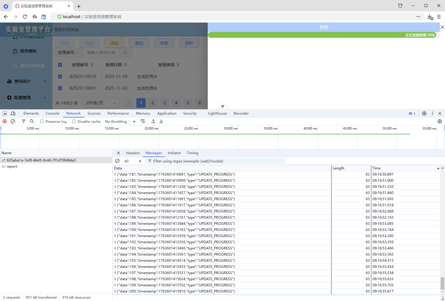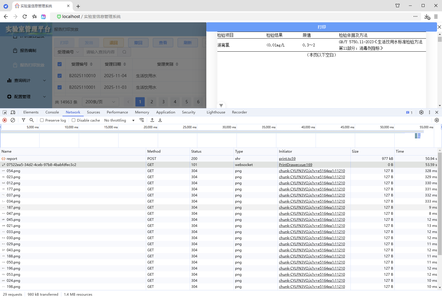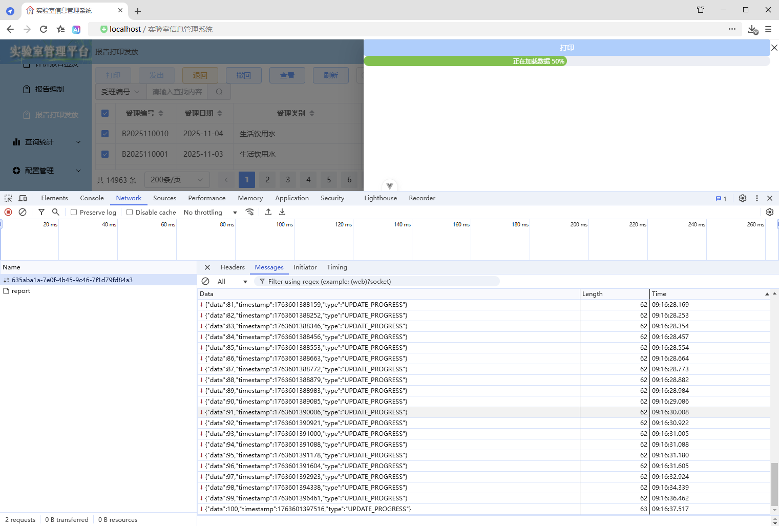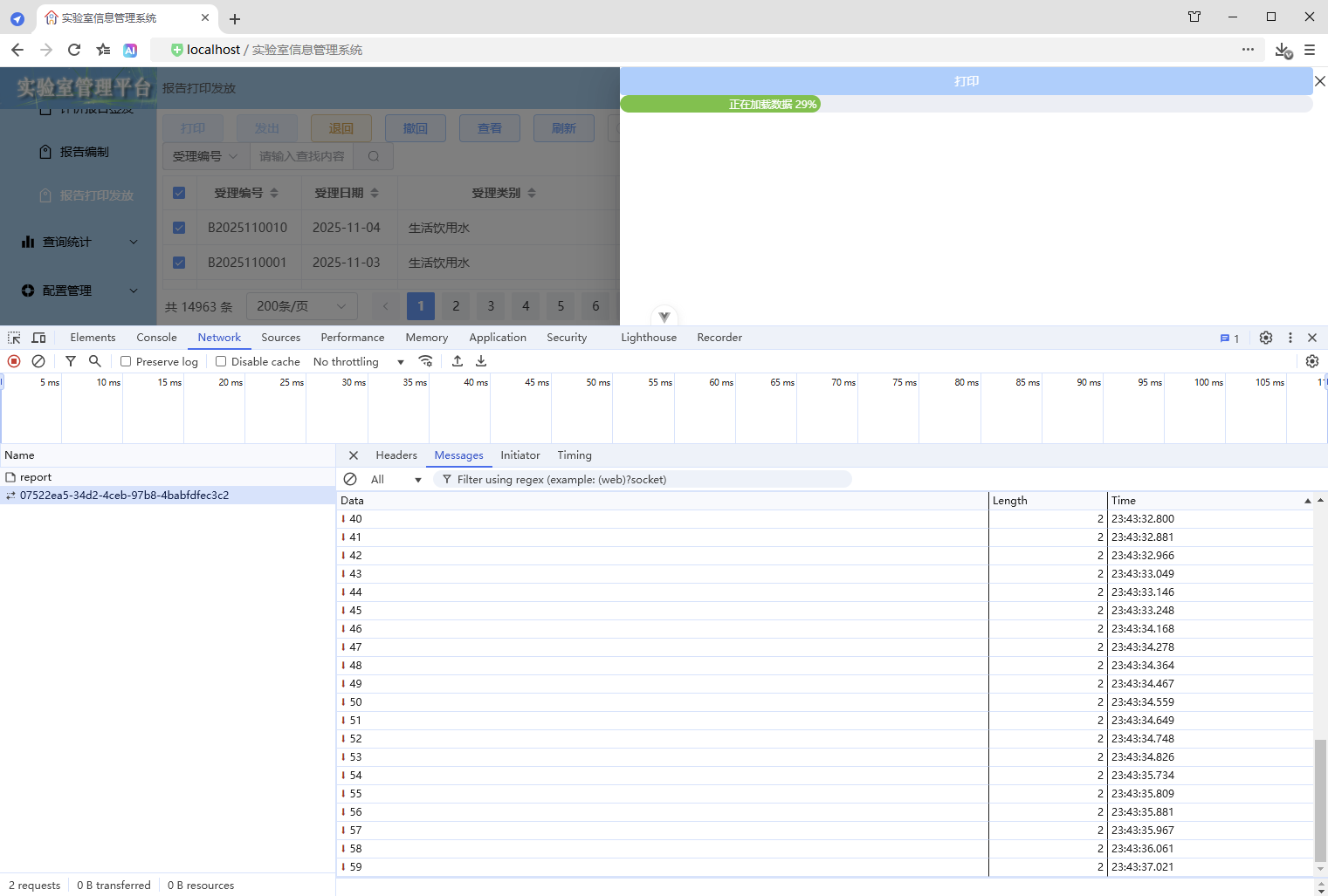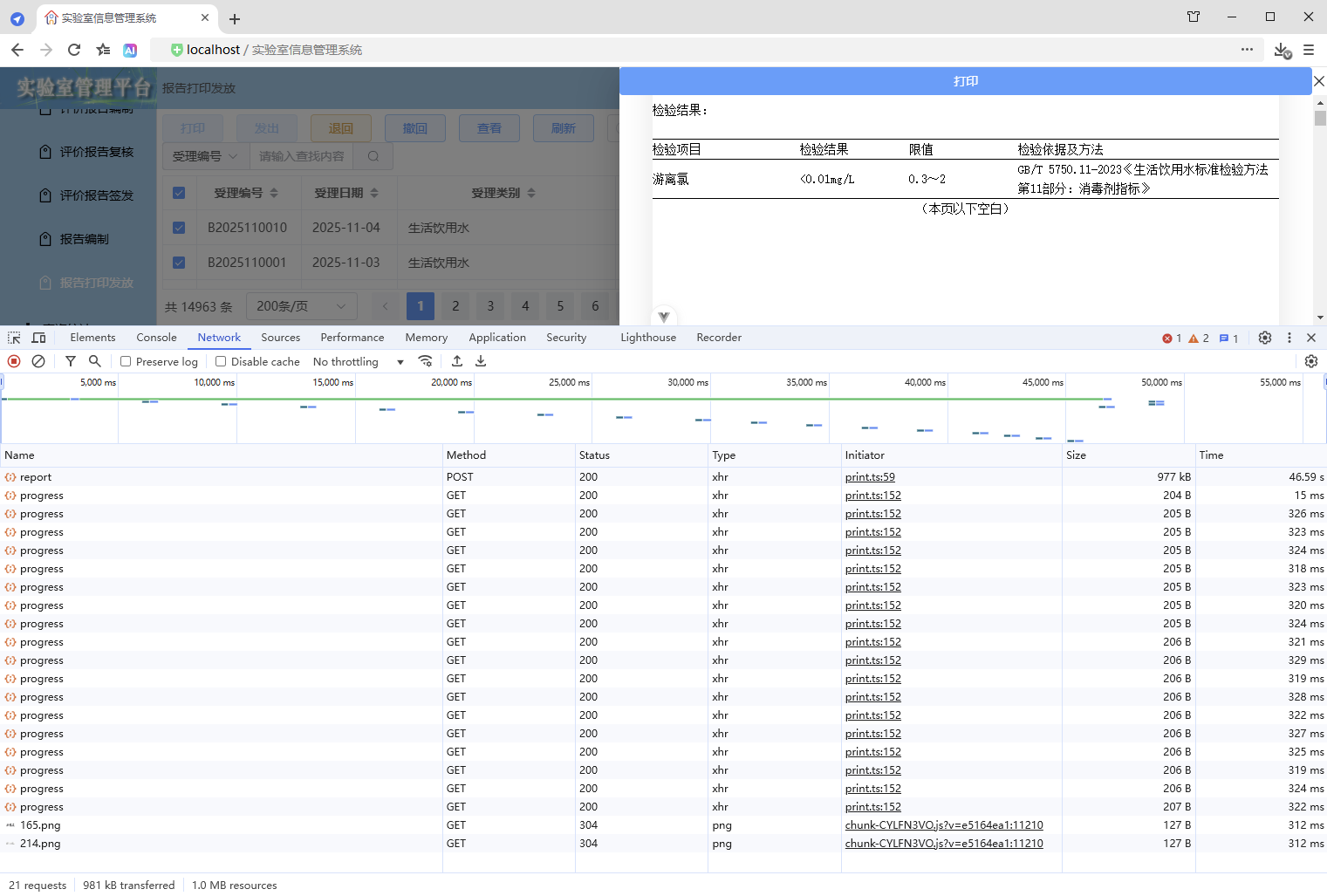 初始情况,打印没有进度条显示:点击【打印/查看】,弹出打印对话框,开始加载数据(200份报告),数据已加载,耗时41.42秒,这个过程页面一直没有变化,需增加进度显示,增强使用体验。原来的代码:打印抽屉。