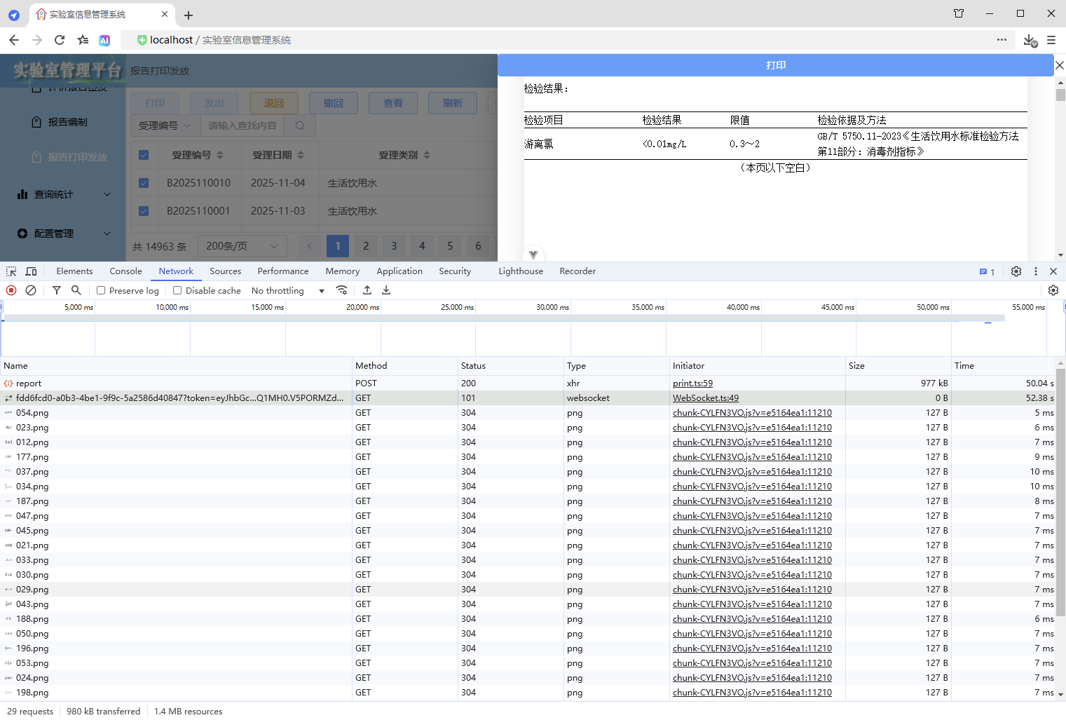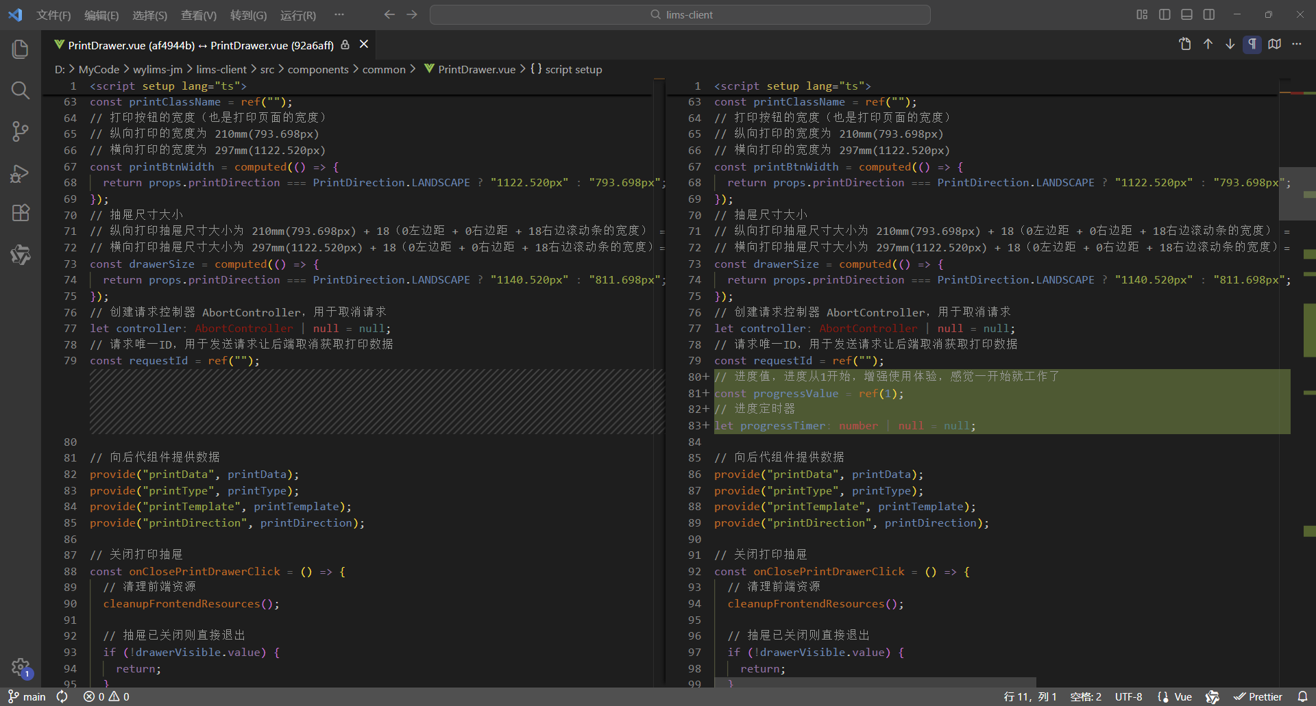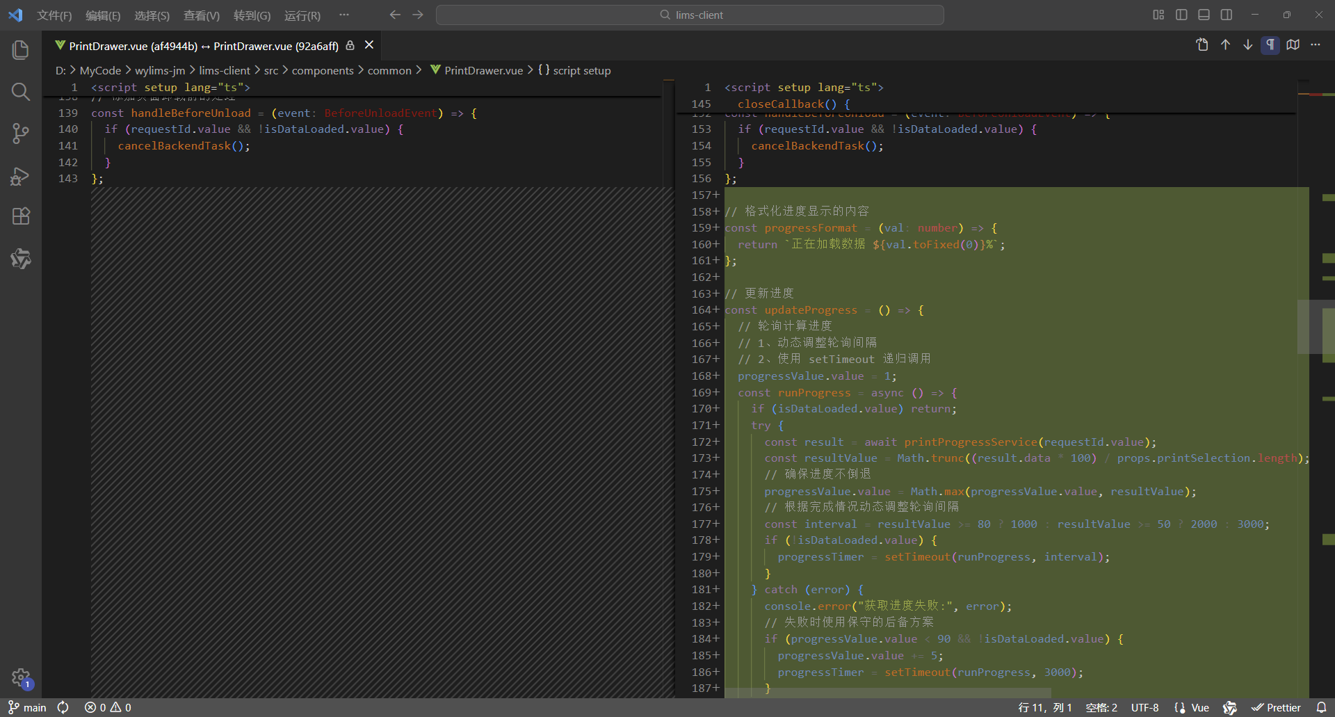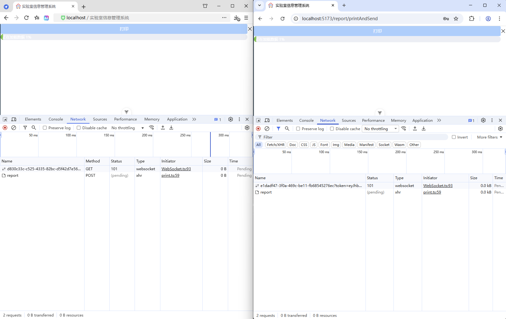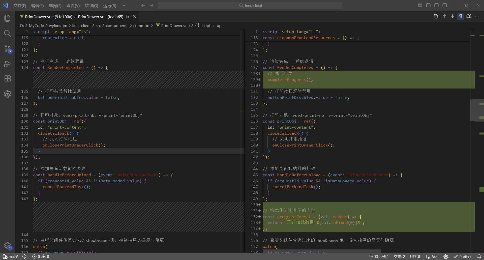 初始情况,打印没有进度条显示:点击【打印/查看】,弹出打印对话框,开始加载数据(200份报告),数据已加载,耗时41.42秒,这个过程页面一直没有变化,需增加进度显示,增强使用体验。原来的代码:打印抽屉。