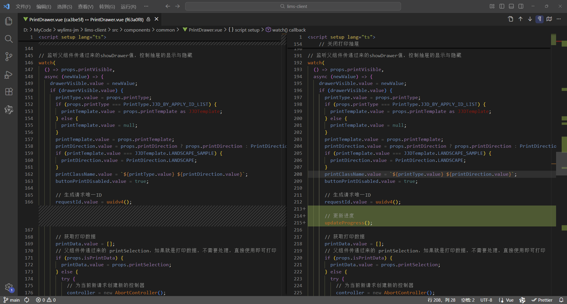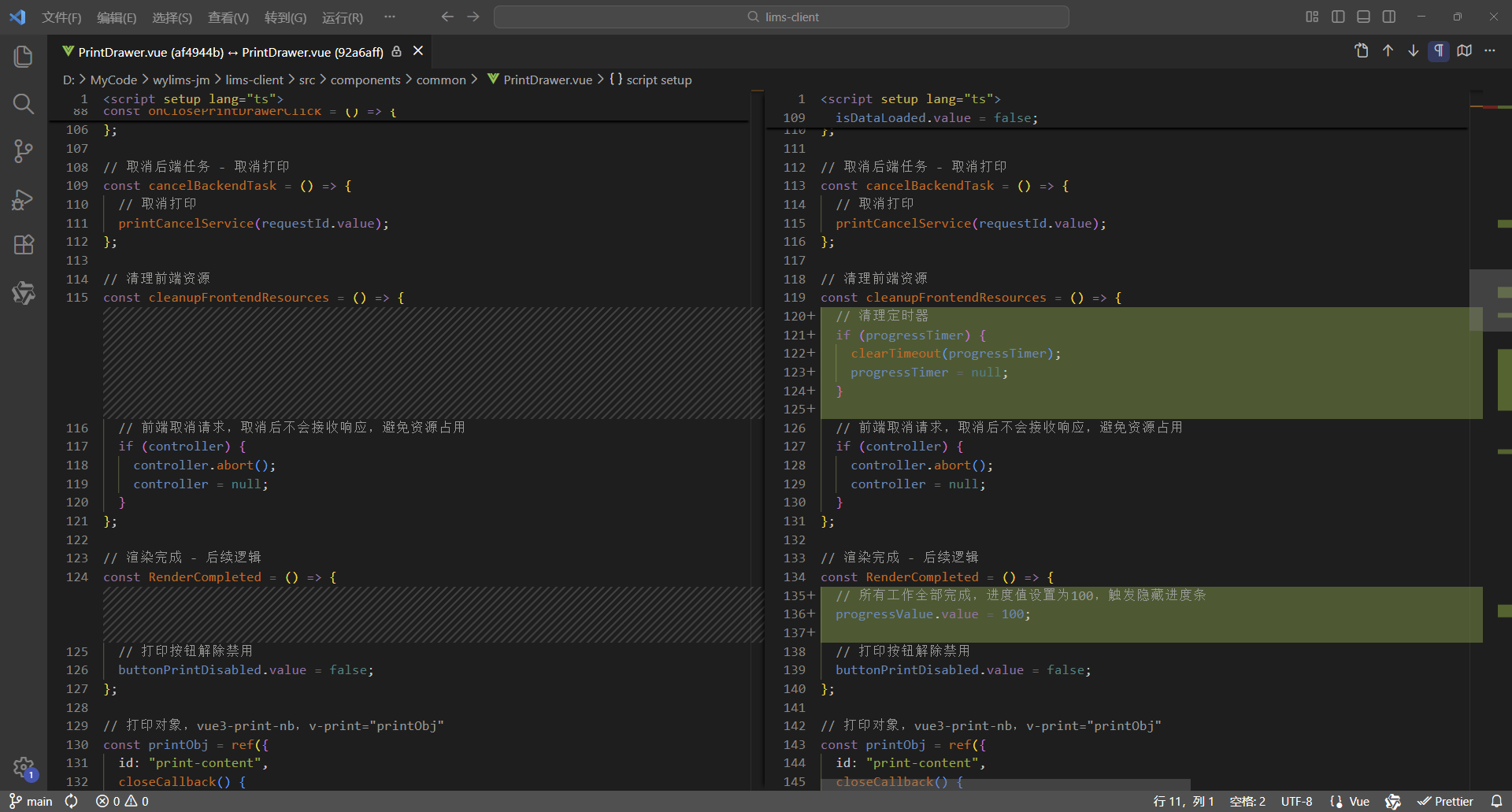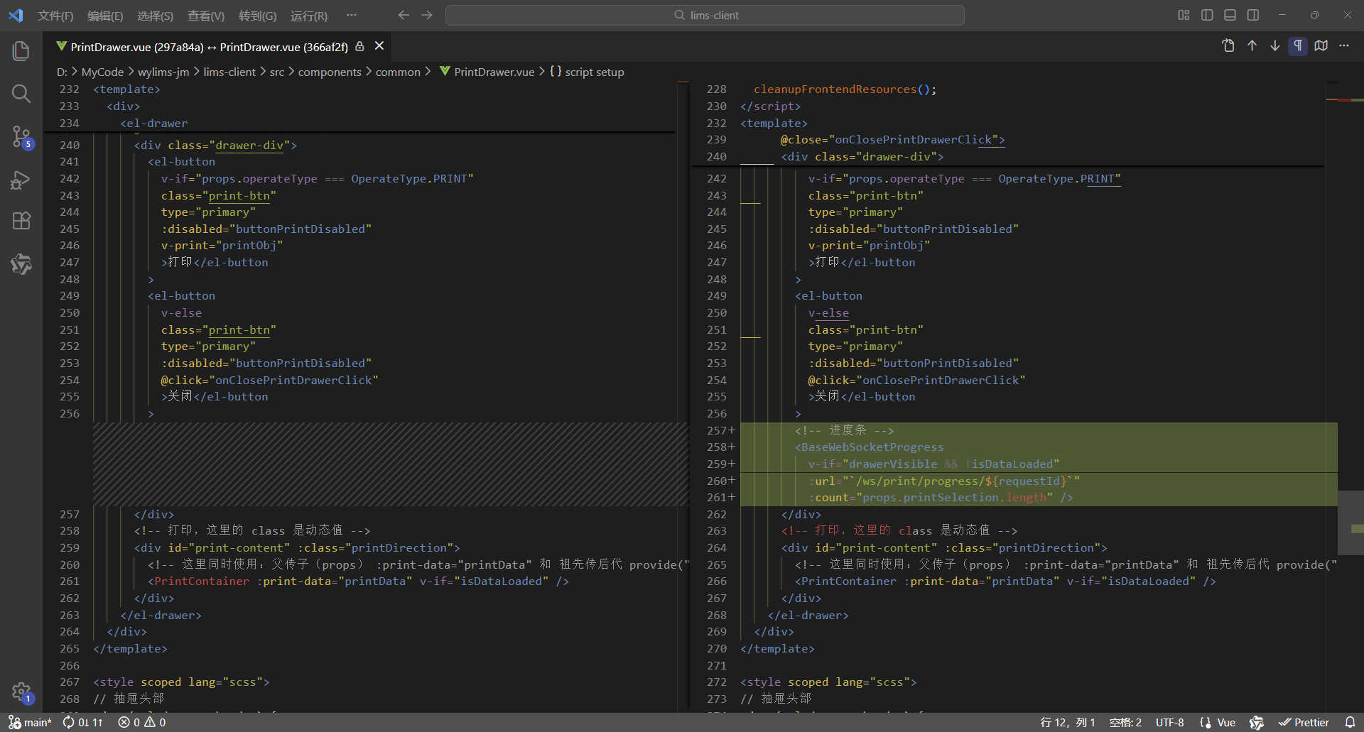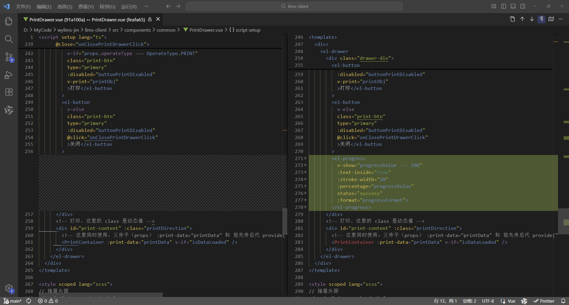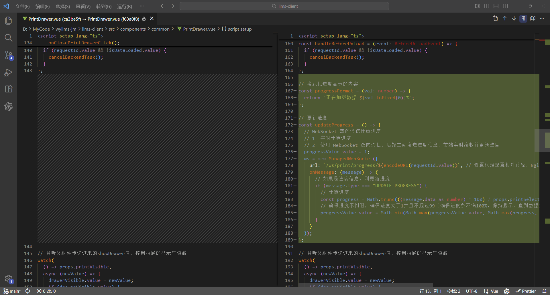 初始情况,打印没有进度条显示:点击【打印/查看】,弹出打印对话框,开始加载数据(200份报告),数据已加载,耗时41.42秒,这个过程页面一直没有变化,需增加进度显示,增强使用体验。原来的代码:打印抽屉。