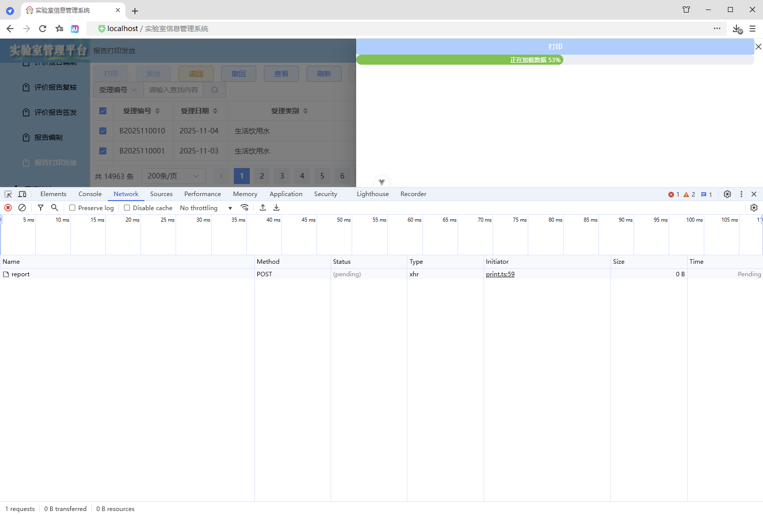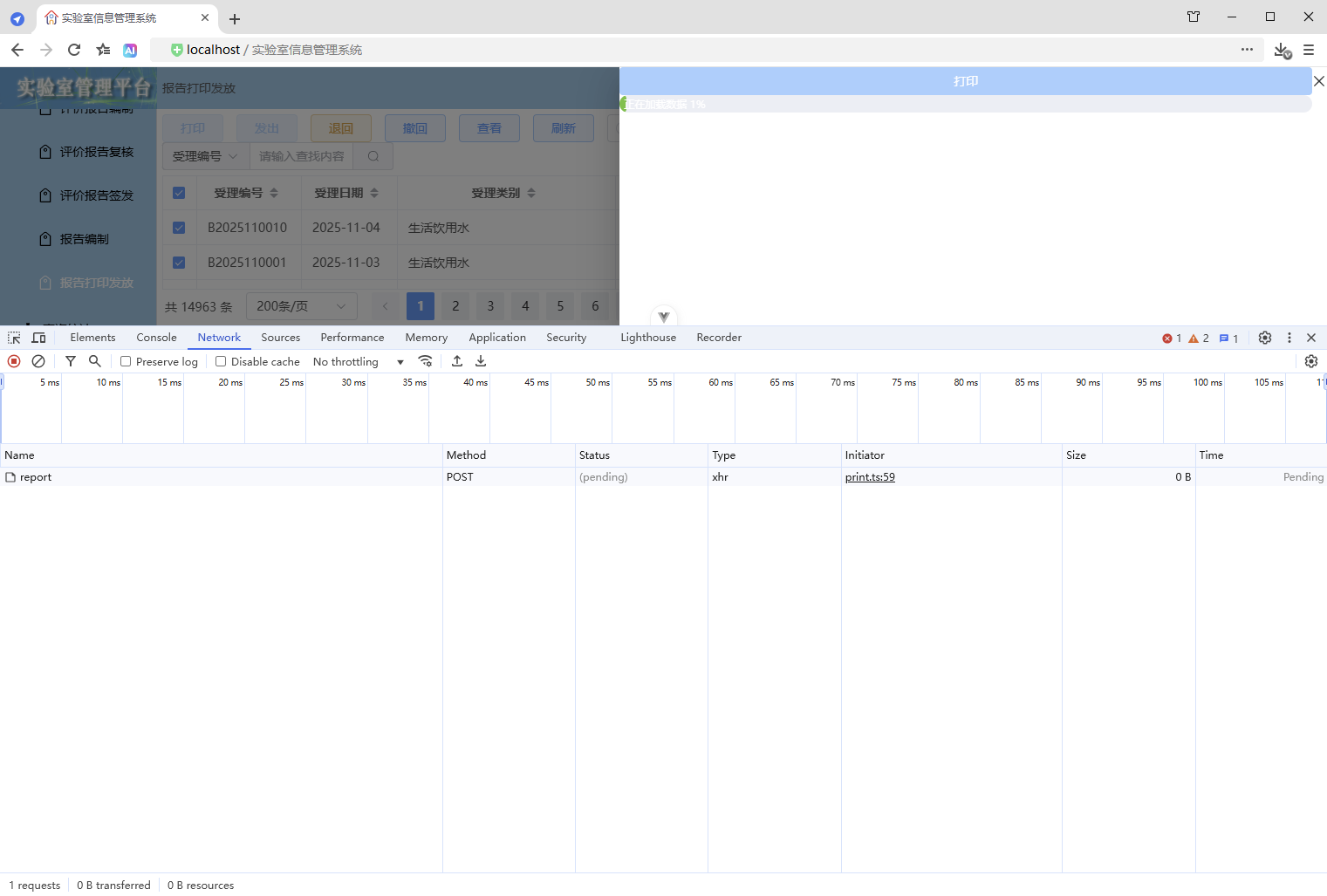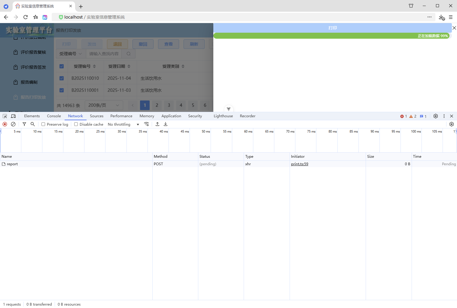 点击【打印/查看】,弹出打印对话框,开始加载数据(200份报告),