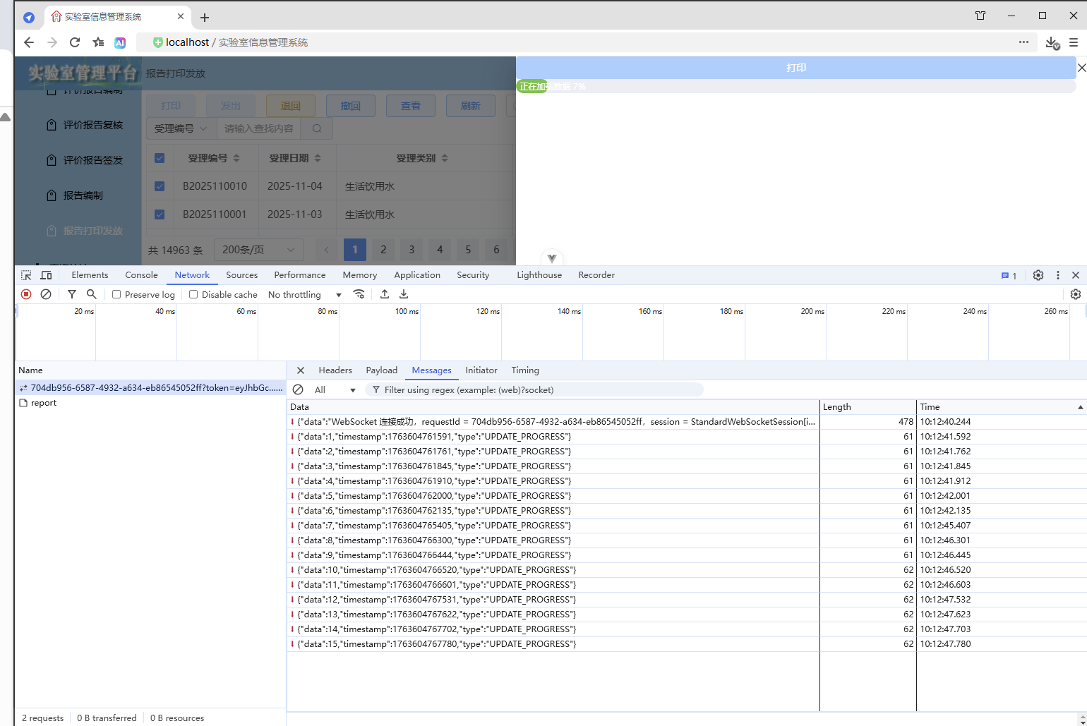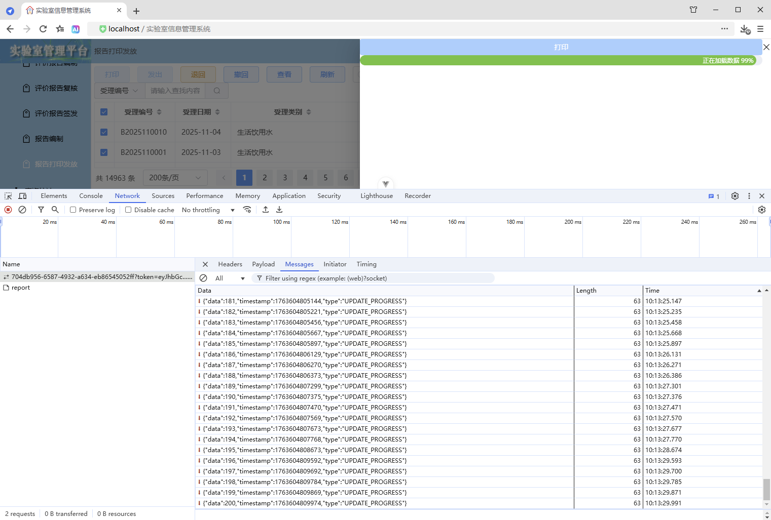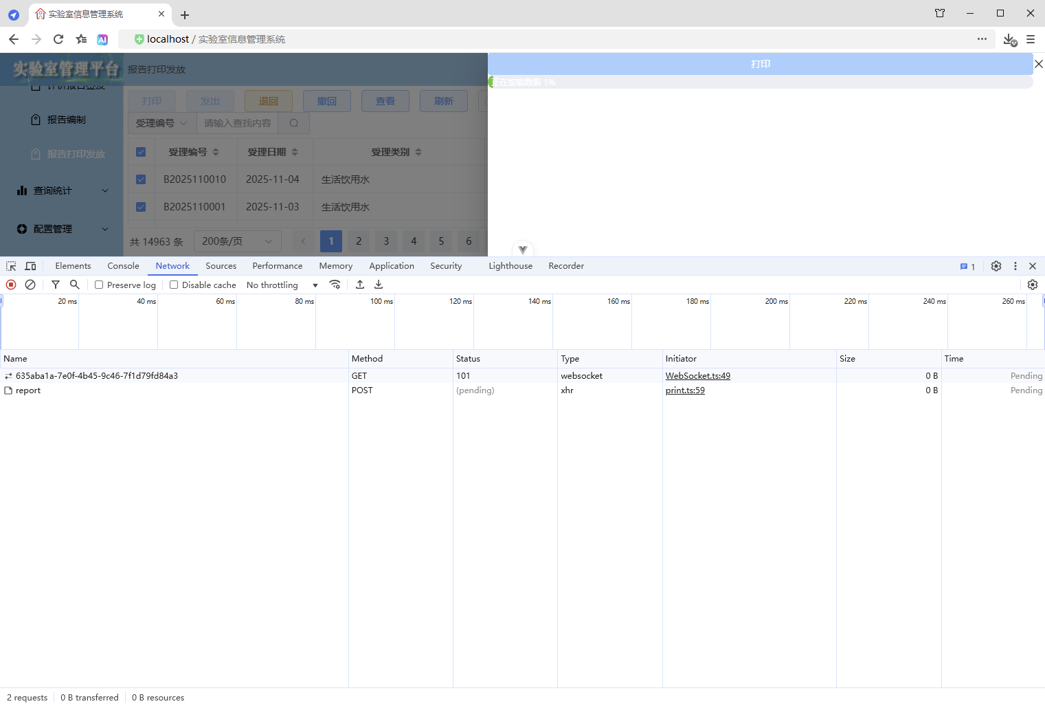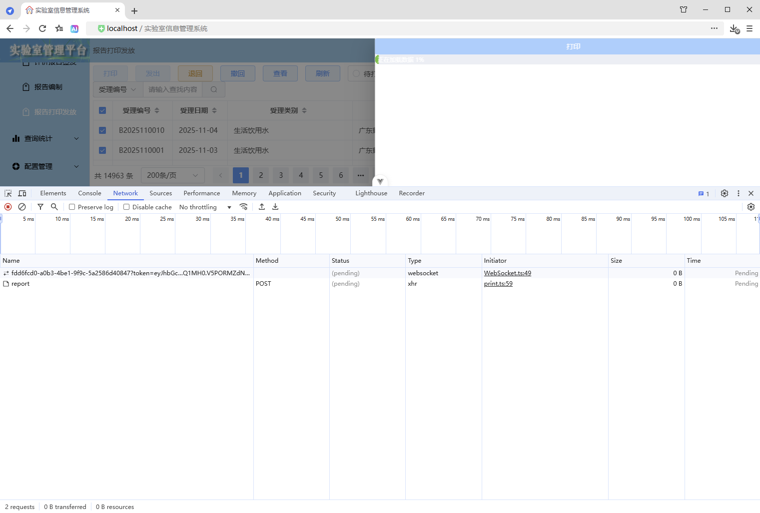 点击【打印/查看】,弹出打印对话框,开始加载数据(200份报告),
