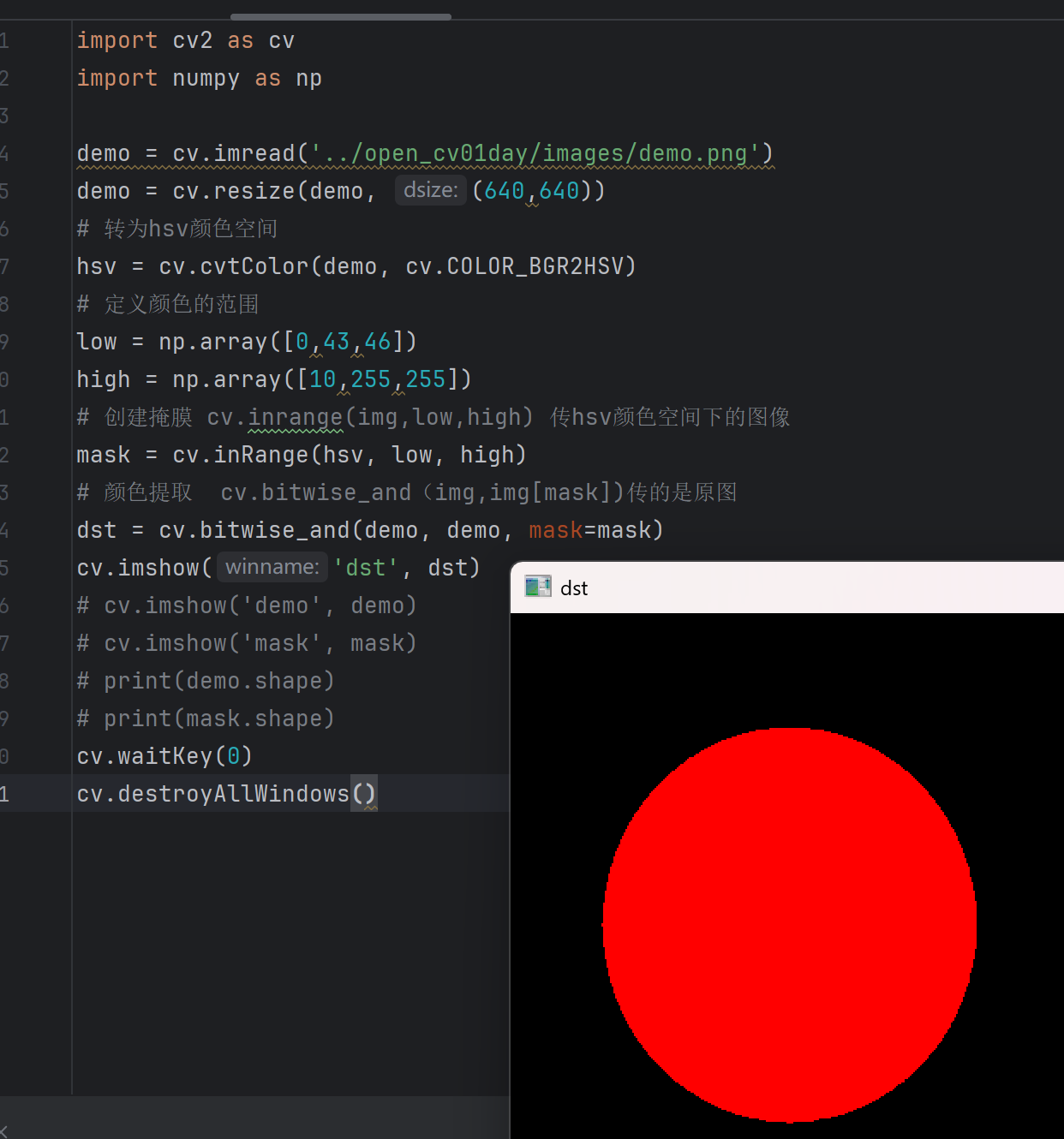 # 创建掩膜 cv.inrange(img,low,high) 传hsv颜色空间下的图像