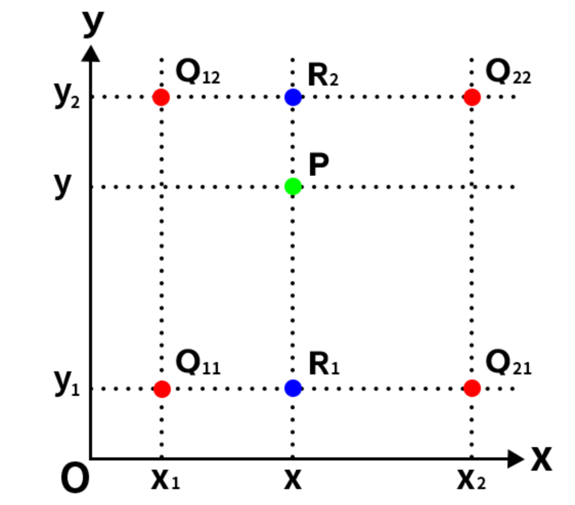(x, y)的像素点,通常记作P00(x0, y0),P01(x0, y1),P10(x1, y0),P11(x1, y1),它们构成一个2x2的邻域矩阵。分别在水平方向和垂直方向上做线性插值: