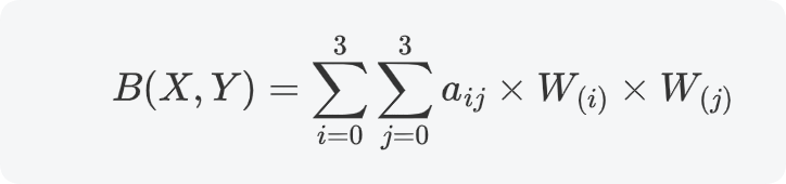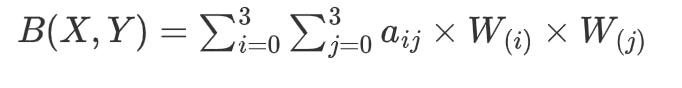 与双三次插值一样,这里也需要将像素点分行和列分别带入计算权重值,其他像素点也是这样的计算过程,最终我们就可以得到P所对应的目标图像B在(X,Y)处的像素值为: