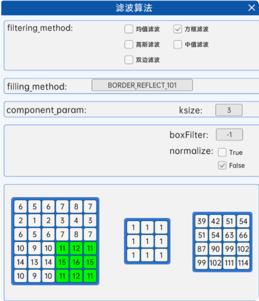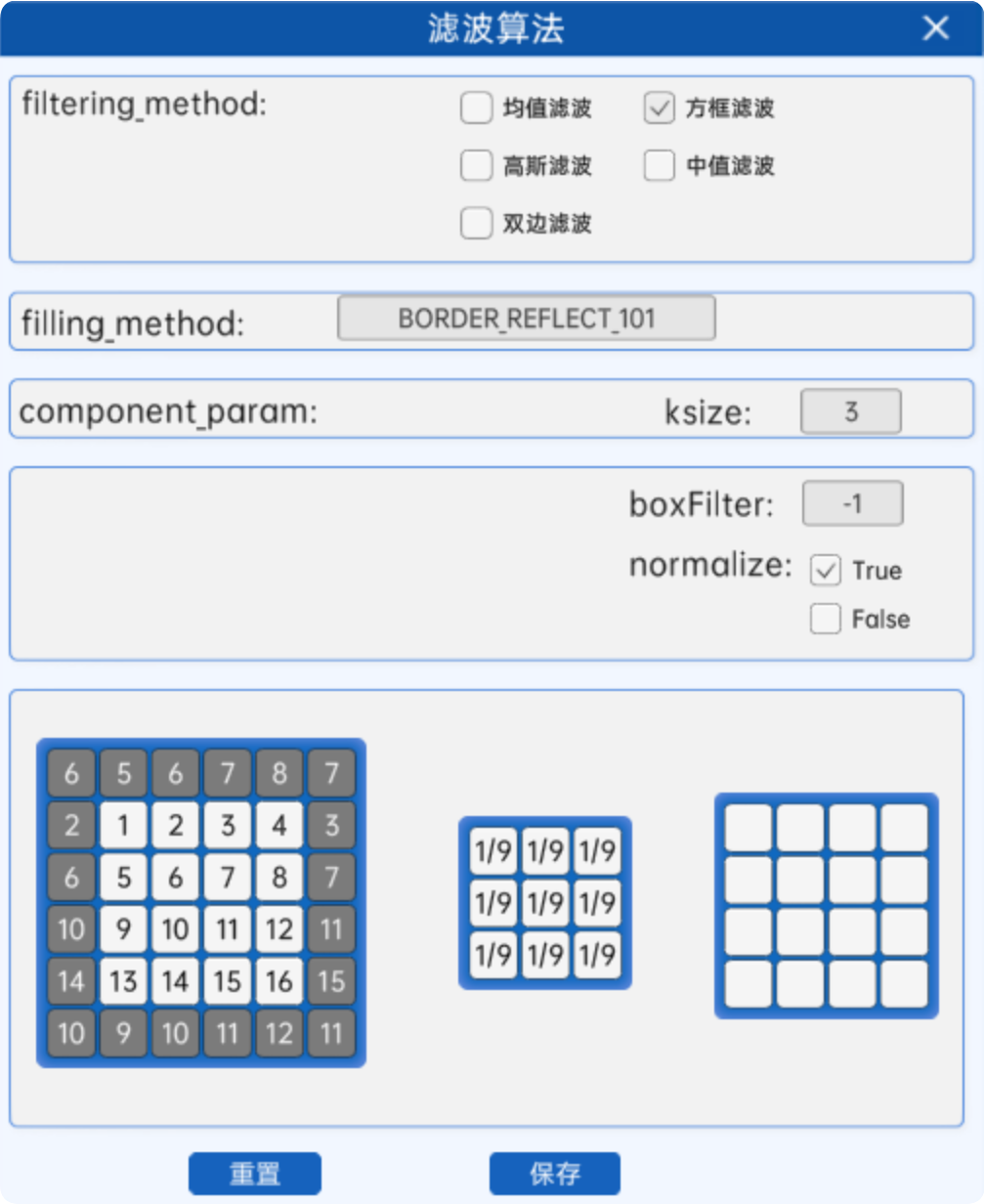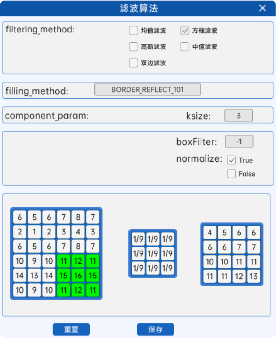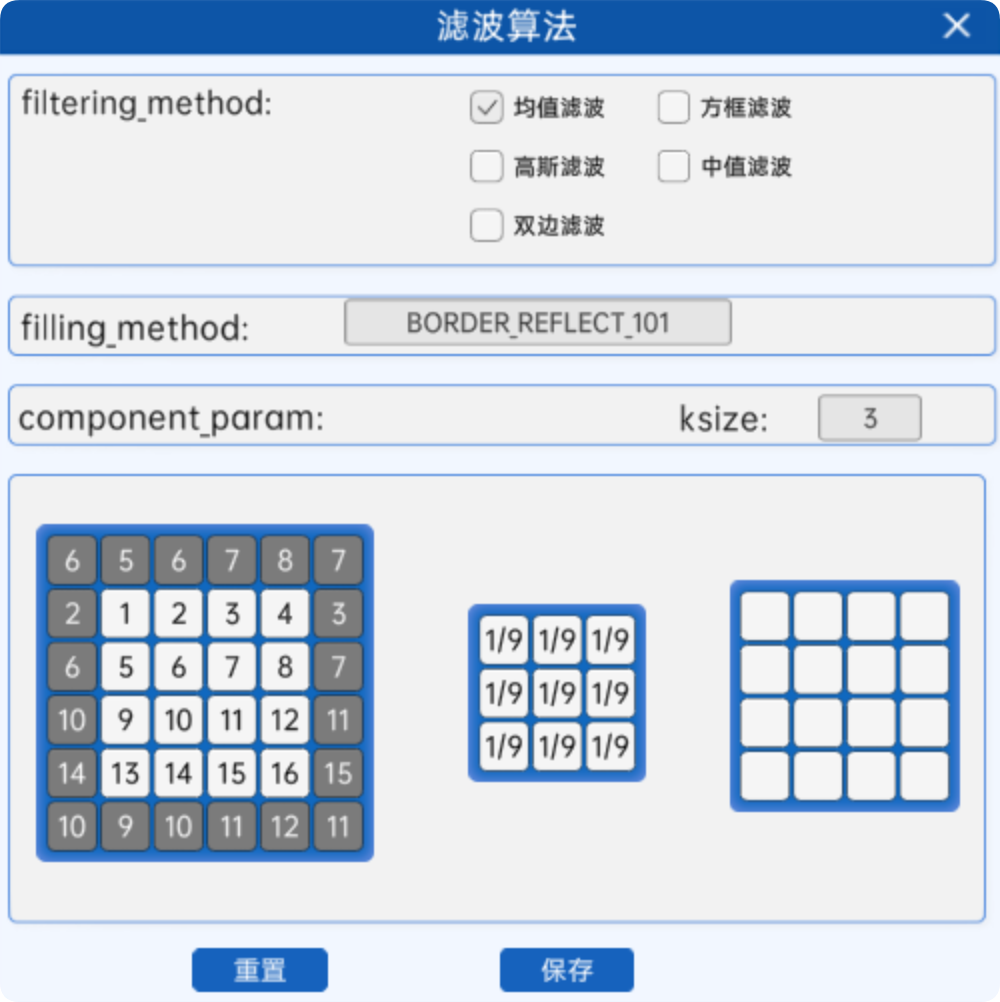 在滤波算法组件中,当参数filtering_method选为均值滤波,参数component_param为ksize,代表卷积核的大小,eg:ksize=3,则代表使用3×3的卷积核。