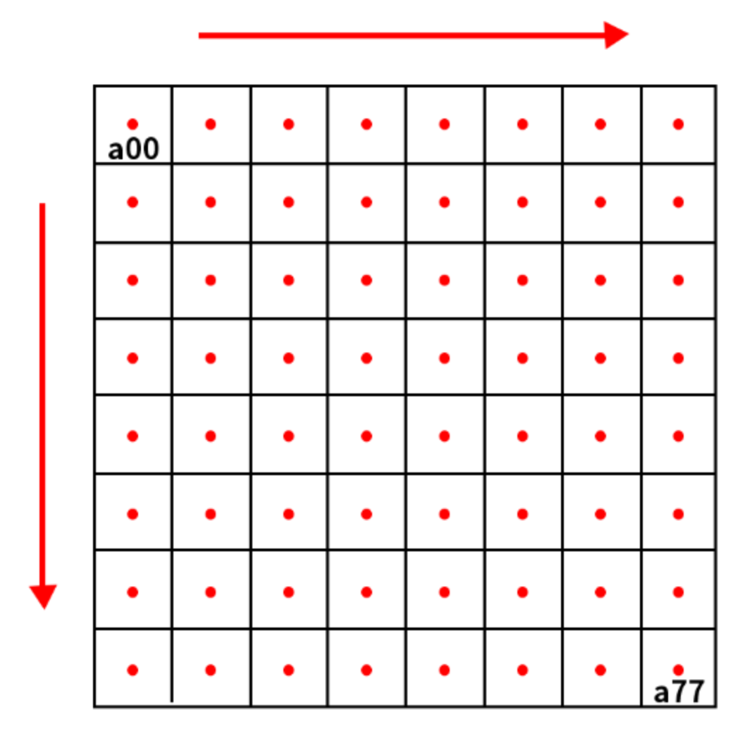 假如下图中的P点就是目标图像B在(X,Y)处根据上述公式计算出的对应于原图像A中的位置,P的坐标位置会出现小数部分,所以我们假设P点的坐标为(x+u,y+v),其中x、y表示整数部分,u、v表示小数部分,那么我们就可以得到其周围的最近的64个像素的位置,我们用a(i,j)(i,j=0,1,2,3,4,5,6,7)来表示,如下图所示。