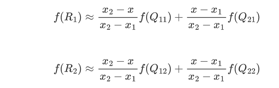 然后根据Q11、Q21得到R1的插值,根据Q12、Q22得到R2的插值,然后根据R1、R2得到P的插值即可,这就是双线性插值。以下是计算过程: