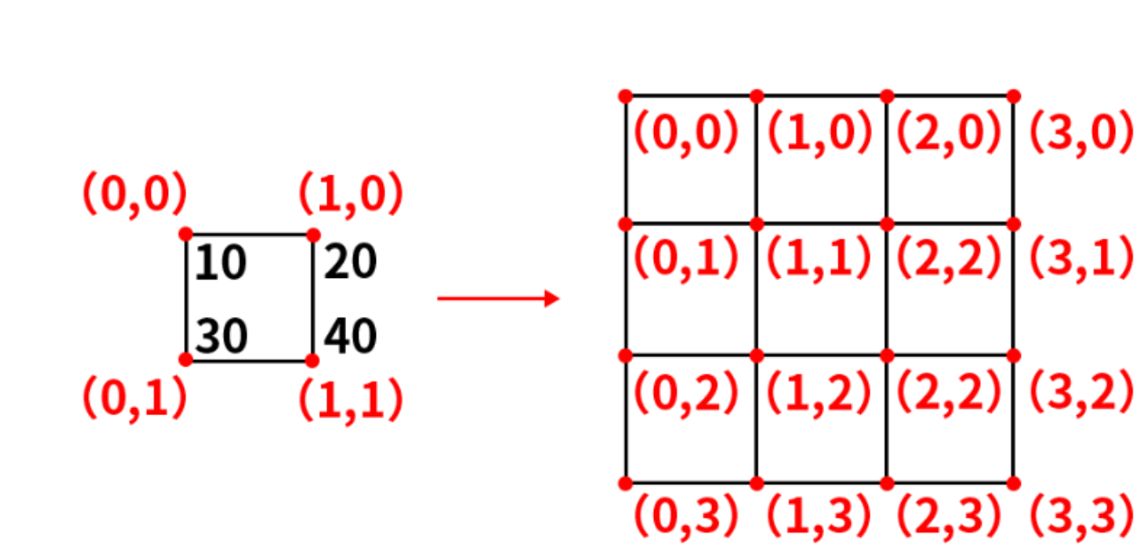 下面这张图是右上角为坐标系原点的情况,我们可以发现最右面的点都会有概率直接复制到目标图像中(至少原点肯定是这样),而且就算不和原图像中的点重合,也相当于进行了1次单线性插值。那么当我们采用不同的坐标系时产生的结果是不一样的,而且无论我们采用什么坐标系,最左侧和最右侧(最上侧和最下侧)的点是“不公平的”,这是第一个问题。