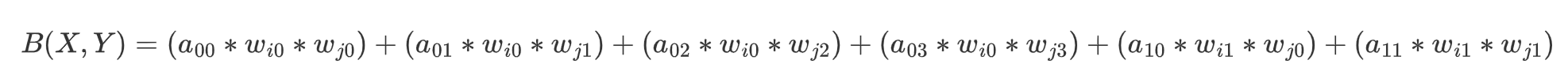 我们要做的就是将上面的16个点相较于p点的位置距离算出来,获取16像素所对应的权重W(d)。然而BiCubic函数是一维的,所以我们需要将像素点的行与列分开计算,比如a00这个点,我们需要将d_x带入BiCubic函数中,计算a00点对于P点的x方向的权重,然后将d_y带入BiCubic函数中,计算a00点对于P点的y方向的权重,其他像素点也是这样的计算过程,最终我们就可以得到P所对应的目标图像B在(X,Y)处的像素值为: