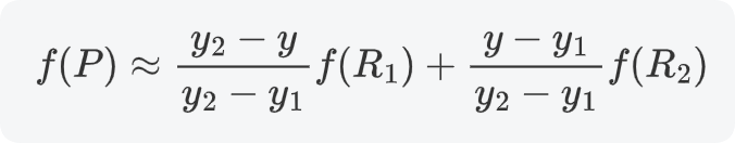 这样就得到了P点的插值。注意此处如果先在y方向插值、再在x方向插值,其结果与按照上述顺序双线性插值的结果是一样的。