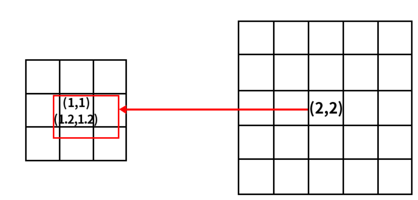 第二个问题时整体的图像相对位置会发生变化。如下图所示,左侧是原图像(3,3),右侧是目标图像(5,5),原图像的几何中心点是(1,1),目标图像的几何中心点是(2,2),根据对应关系,目标图像的几何中心点对应的原图像的位置是(1.2,1.2),那么问题来了,目标图像的原点(0,0)和原始图像的原点是重合的,但是目标图像的几何中心点相对于原始图像的几何中心点偏右下,那么整体图像的位置会发生偏移,所以参与计算的点相对都往右下偏移会产生相对的位置信息损失。这是第二个问题。