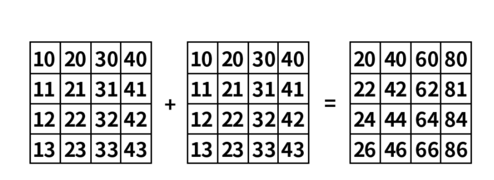 将模板的形状添加到水印区域之后,就可以将该图像与原始的模板图进行图像融合。该组件的目的就是将图像对应的数组中的对应元素进行相加(一定要注意这里的两个数组是规格相同的,也就是说要么都是灰度图,要么都是彩图),其过程如下图所示。