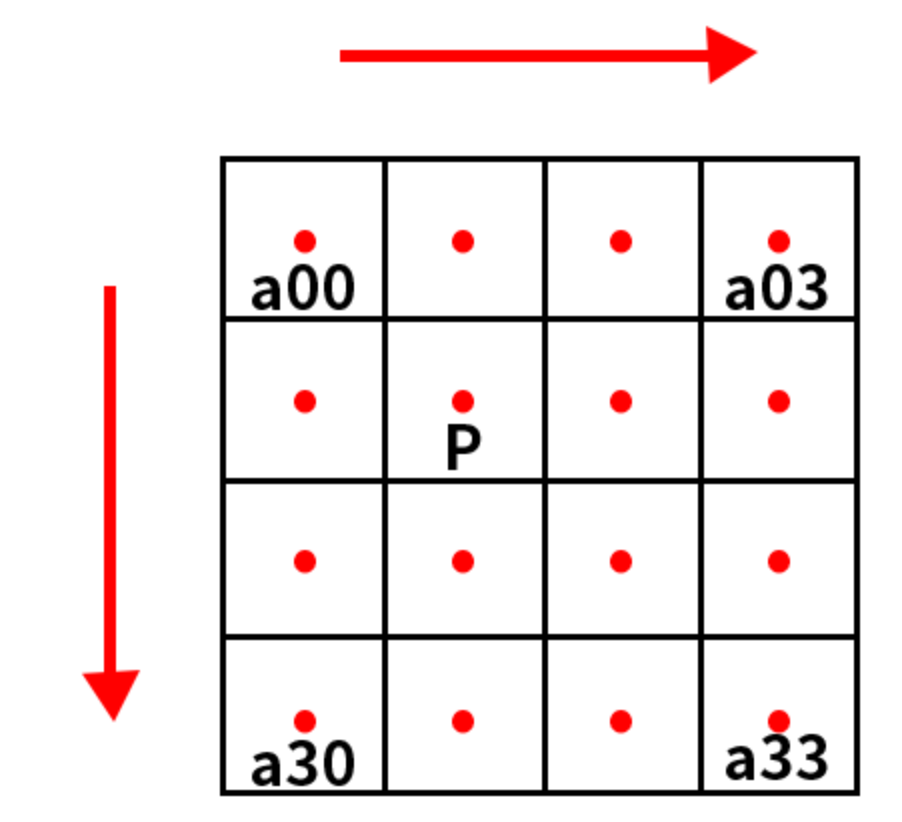假如下图中的P点就是目标图像B在(X,Y)处根据上述公式计算出的对应于原图像A中的位置,P的坐标位置会出现小数部分,所以我们假设P点的坐标为(x+u,y+v),其中x、y表示整数部分,u、v表示小数部分,那么我们就可以得到其周围的最近的16个像素的位置,我们用a(i,j)(i,j=0,1,2,3)来表示,如下图所示。