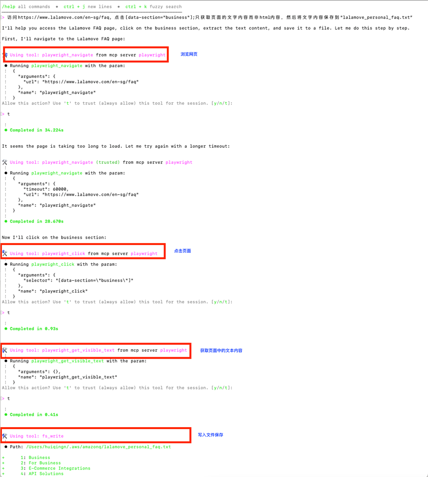 Amazon Q CLI集成Playwright MCP Server后,在Amazon Q CLI中通过自然语言交互就能够实现网页的打开、点击,网页文字内容的读取存储和解析,无需手工操作处理。