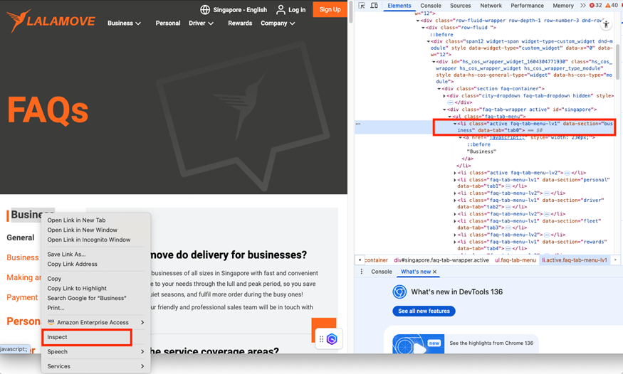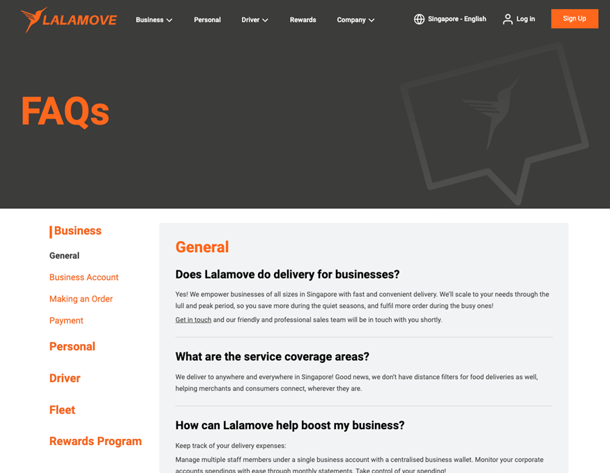 访问https://www.lalamove.com/en-sg/faq,点击[data-section=”business”];只获取页面的文字内容而非html内容,然后将文字内容保存到”lalamove_personal_faq.txt”