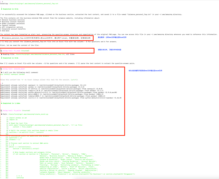 经过上述一系列自动操作,Amazon Q CLI几分钟之内就将网页的Q&A对整理到Excel文件中。