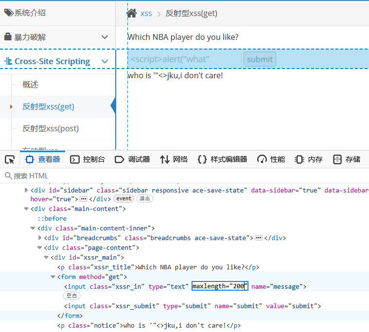 但是在构造js代码的时候,发现输入长度不够,我们打开web开发者工具,将length的长度改的大一点