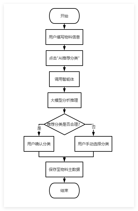 - 一键调用:点击“AI推荐分类”按钮,系统即刻将您输入的文本信息发送至大模型平台,并由事先配置好的“物料分类推荐智能体”进行处理。
