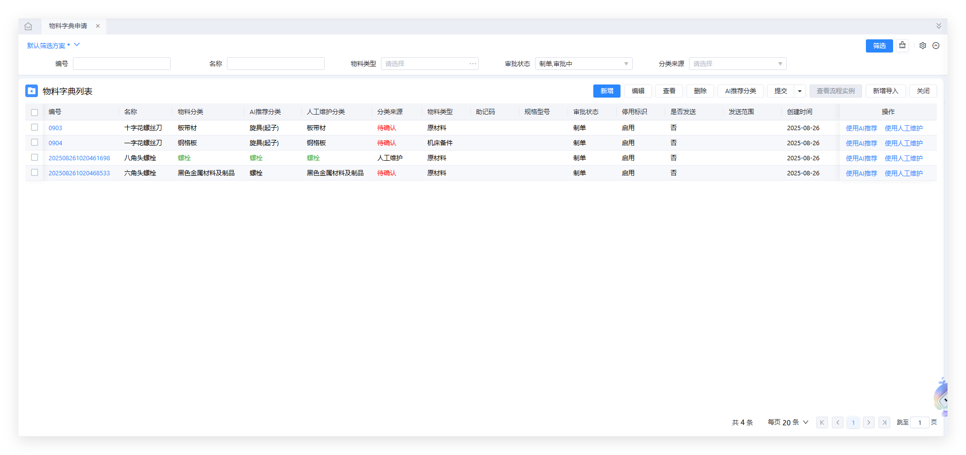 - 业务落地,无缝集成:智能能力最终在物料字典维护界面发挥作用。当用户新建或编辑一条物料数据时(如填写“物料描述”、“规格型号”等字段),系统提供了“AI推荐分类”按钮。