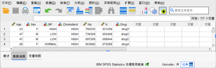 在SPSS的变量视图中,建立“Age”、“Sex”、“BP”、“Cholesterol”、“Na”、“K”和“Drug”7个变量,分别表示试用患者的年龄、性别、血压、类胆固醇含量、Na含量、K含量和药物类型,如图7-6所示。