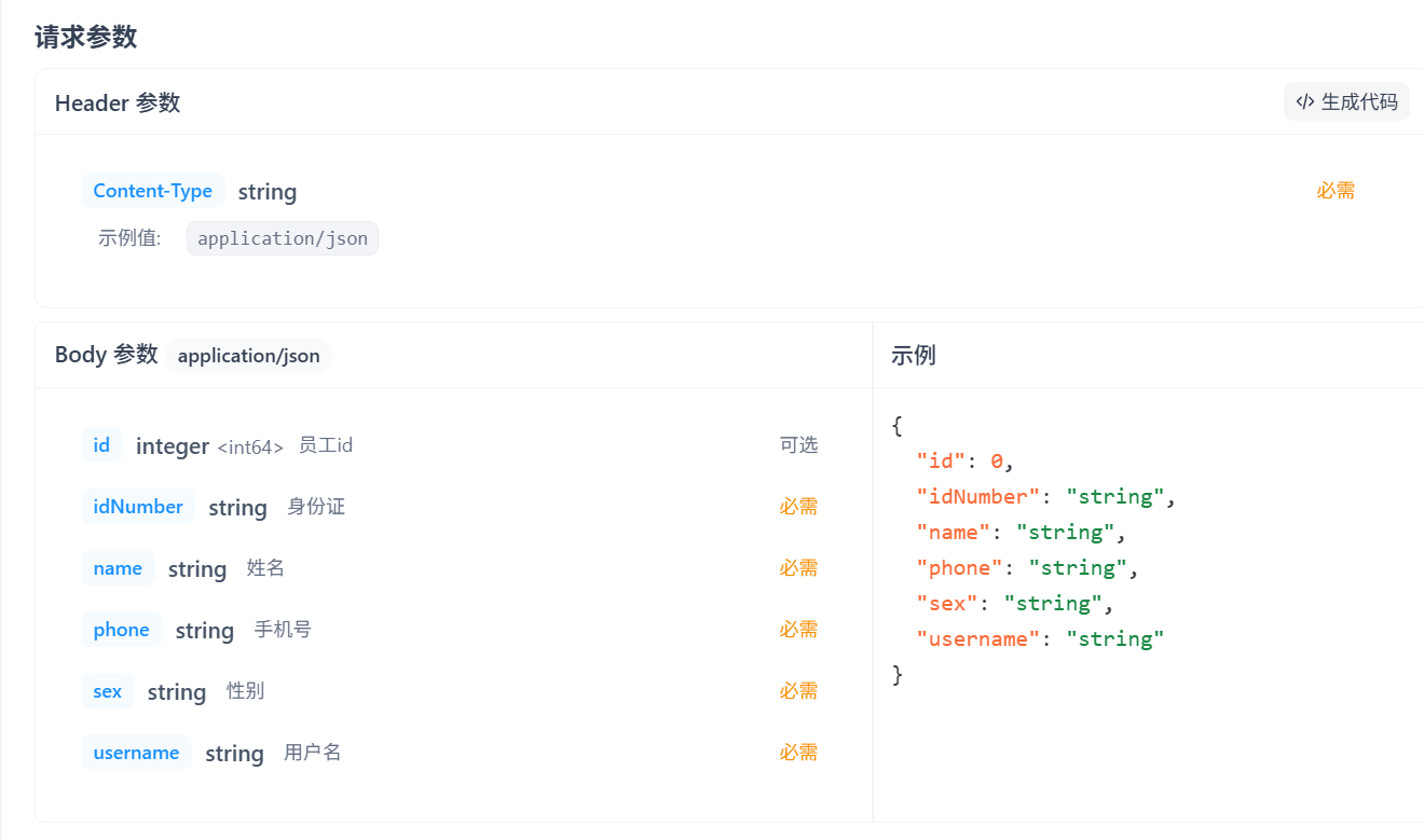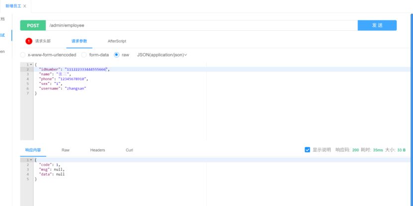 请求参数需要两样东西,一个是放在header中JWT校验码,一个是以json形式传入的有关employeeDTO的body参数【这里id是自增的,所以是可选参数】