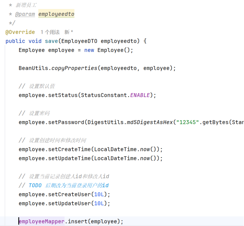 这里是让employeeDTO 和employee进行一个数据的”交接”,因为数据库最后储存的还是employee格式的数据,数据从前端先是传给DTO,在从DTO通过BeanUtils类中的copyProperties 传给employee,最后将其他没有传递的数据设置上相应的值