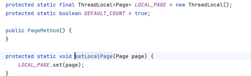 打开这个方法,可以看到这里定义了一个ThreadLocal变量LoCAL_PAGE,以及setLocalPage方法,这个方法用set()给Page数据储存在线程空间里(page中封装了页码和每页展示数,即limit后第一个数和第二个数,下面一行代码是page的对象创建)。