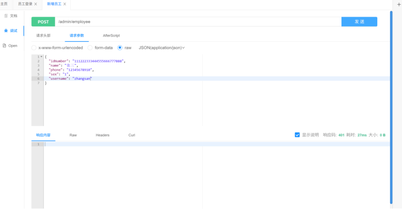 打开Apifox,进入管理端接口项目,在员工项目里找到新增员工,查看需求,具体看以下几个: