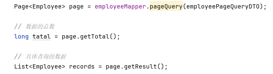 接着在执行employee.pageQuery()的时候会用get()给这几个数取出来,而具体查询到的数据会封装到Page<E>中return返回