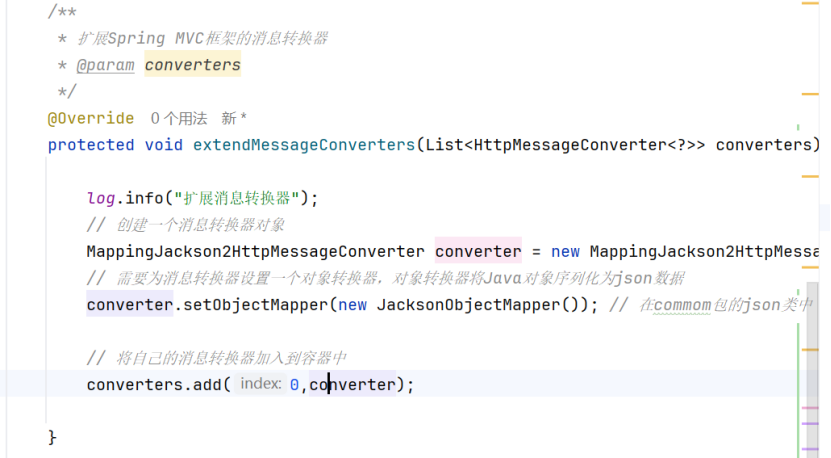 这里只要在配置类中(WebMVCConfiguration)中重写extendMessageConverters方法即可