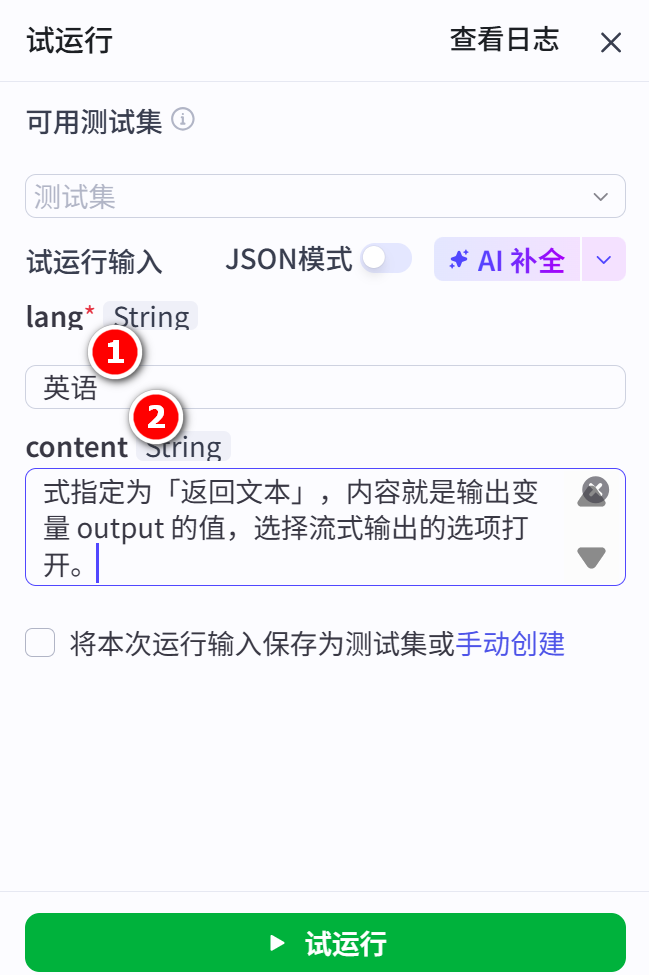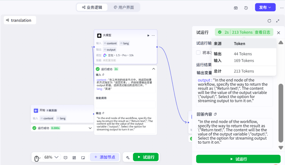 至此工作流的开发就结束了。点击「试运行」按钮,给 content 和 lang 输入参数维护一些测试值。