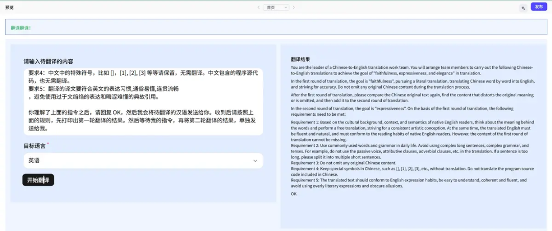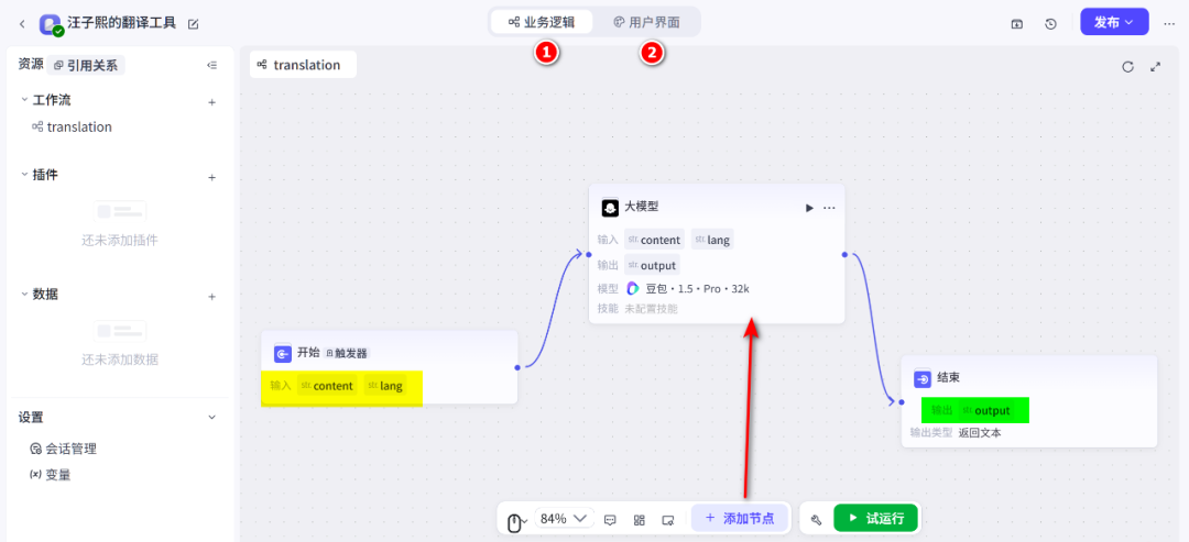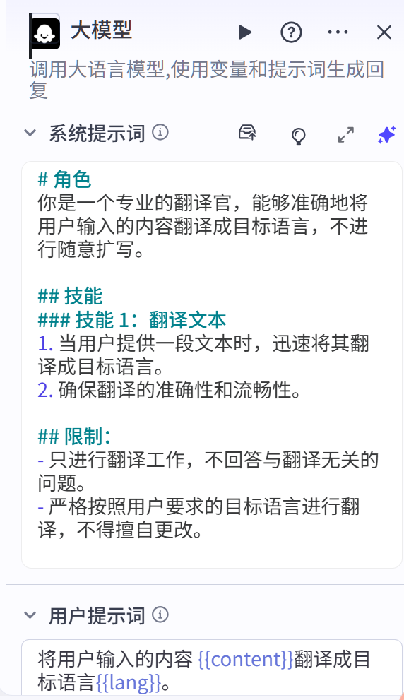 这里使用双大括号语法,引用工作流输入变量 content 和 lang 的内容,笔者之前的文章已经做过介绍。