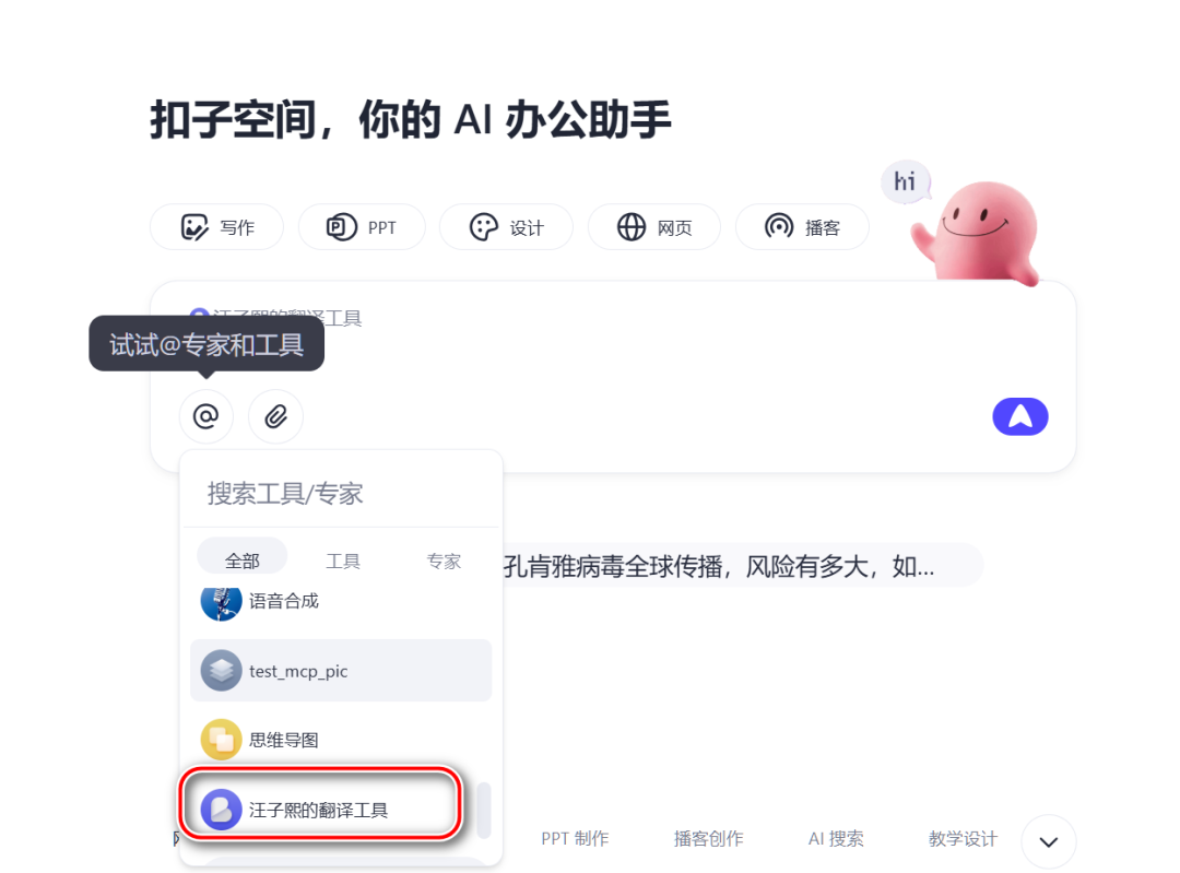 在扣子空间里新建一个任务,点击 `@`符号选中刚刚发布的工作流: