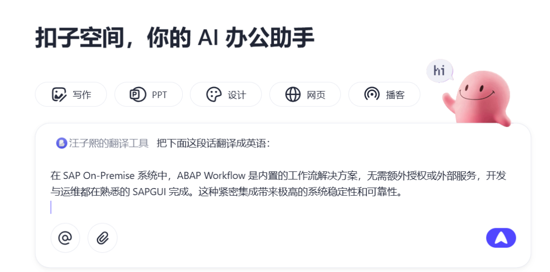 最近笔者接触扣子空间的智能体工作流开发平台,学习起来非常轻松,有降维打击的感觉。毕竟这个 2C 领域的工作流开发平台,其流程定义、任务分派、错误处理、版本控制等核心点,都不可能超过 SAP 解决方案的复杂度。