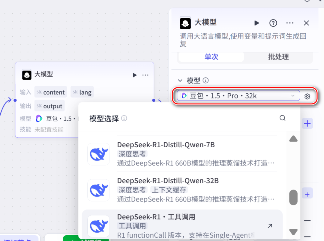 在大模型的模型下拉列表里,可以选择豆包,DeepSeek,Kimi,百川,通义千问,智谱,Minimax 等各个厂家的大模型,每个厂家又提供了参数各异的细分模型可供选择。