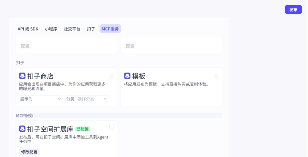 点击右上角的「发布」按钮,可以将这个工作流发布到 MCP 服务类别的扣子空间扩展库中。