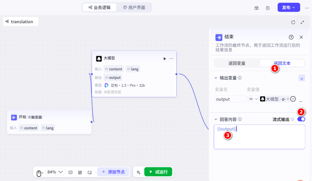 在工作流的结束节点中,将返回结果的方式指定为「返回文本」,内容就是输出变量 output 的值,选择流式输出的选项打开。