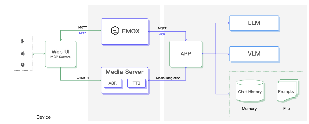 AI 服务方面,开发者可以接入多种语音识别与合成服务,实现多语言、多音色的自然交互;同时,主流的大语言模型(LLM)与视觉语言模型(VLM)也能无缝集成,为设备带来更强的语义理解与多模态处理能力。而对于有数据安全与合规需求的场景,还可以选择在本地完成 Media Server 以及 Agent 的私有化部署。